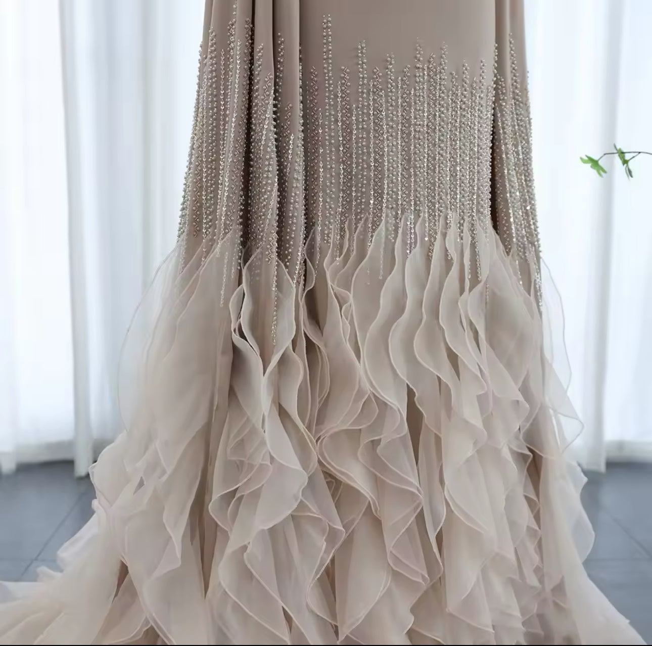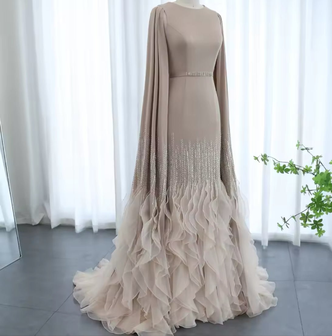 Introducing the Garitta dress from our luxurious collection, featuring elegant cape sleeves and exquisite pearl detailing. This exclusive piece is available for preorder and boasts a beautiful fitting for a truly refined and sophisticated look. Elevate your wardrobe with this tasteful and timeless addition.