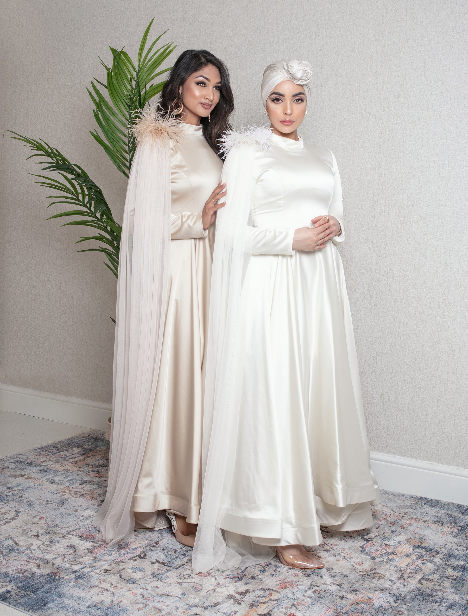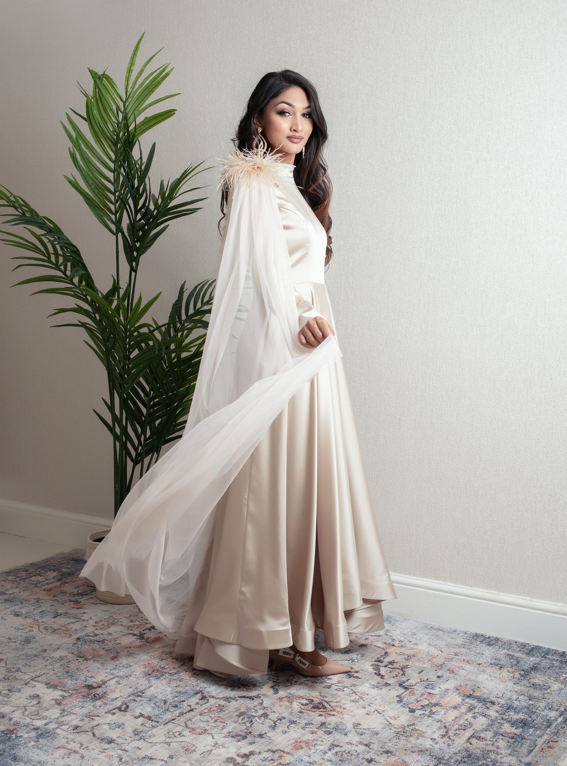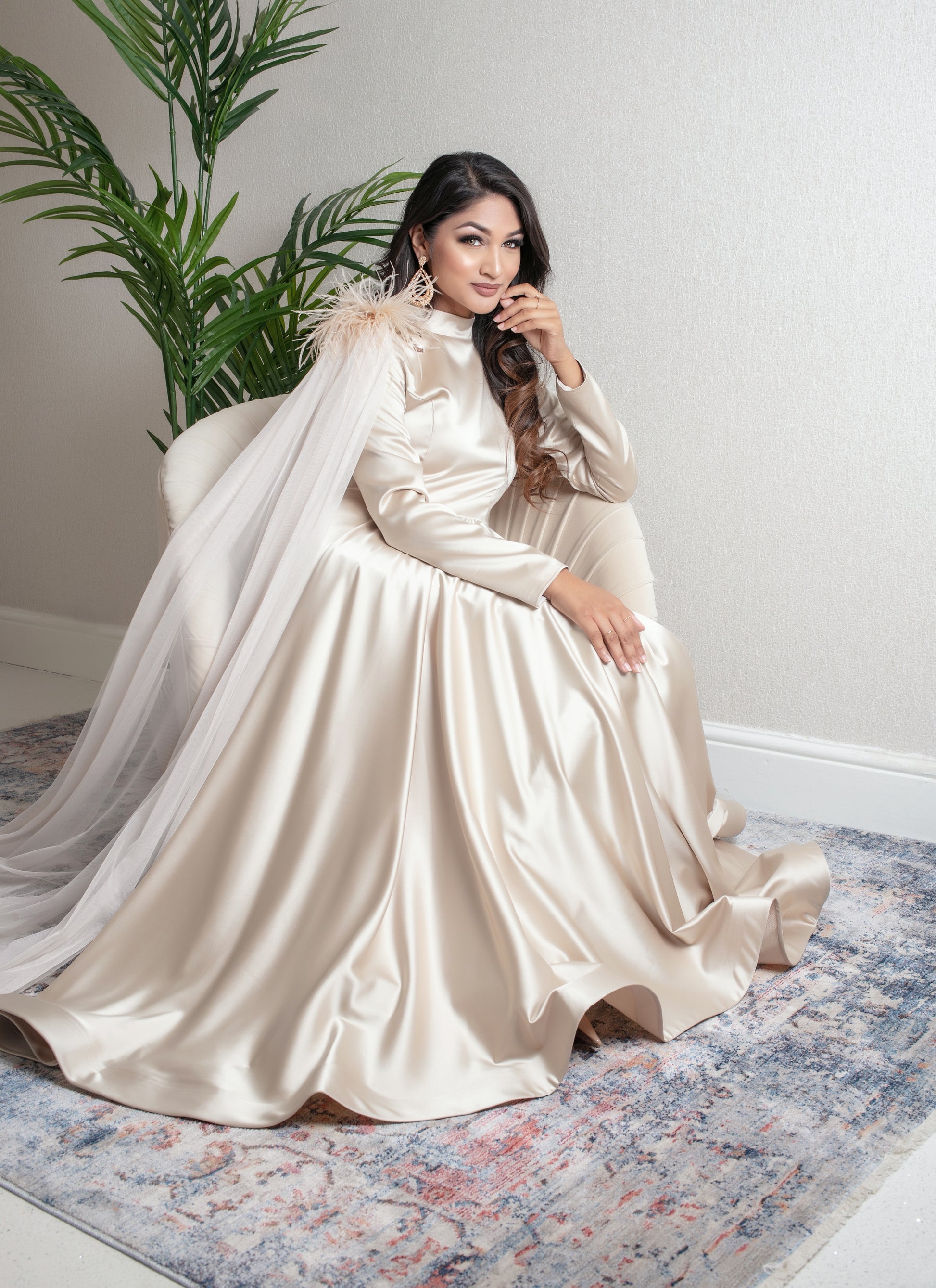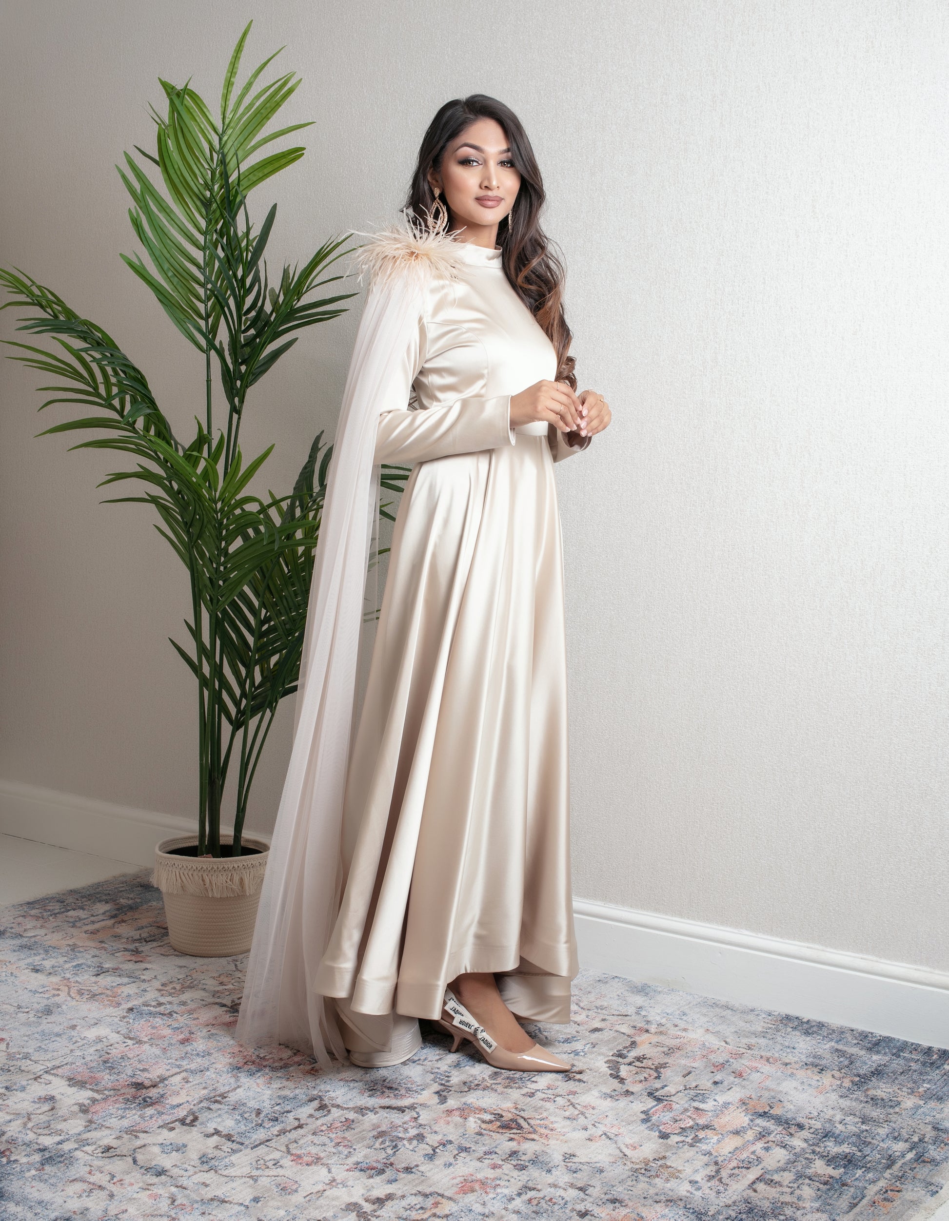 Indulge in opulence with the Morwarid satin dress. Elevate any event with its flowing silhouette, intricate feather work, and luxurious shoulder scarf. This gown is a true work of art, exuding elegance and sophistication. Make a statement and leave a lasting impression.