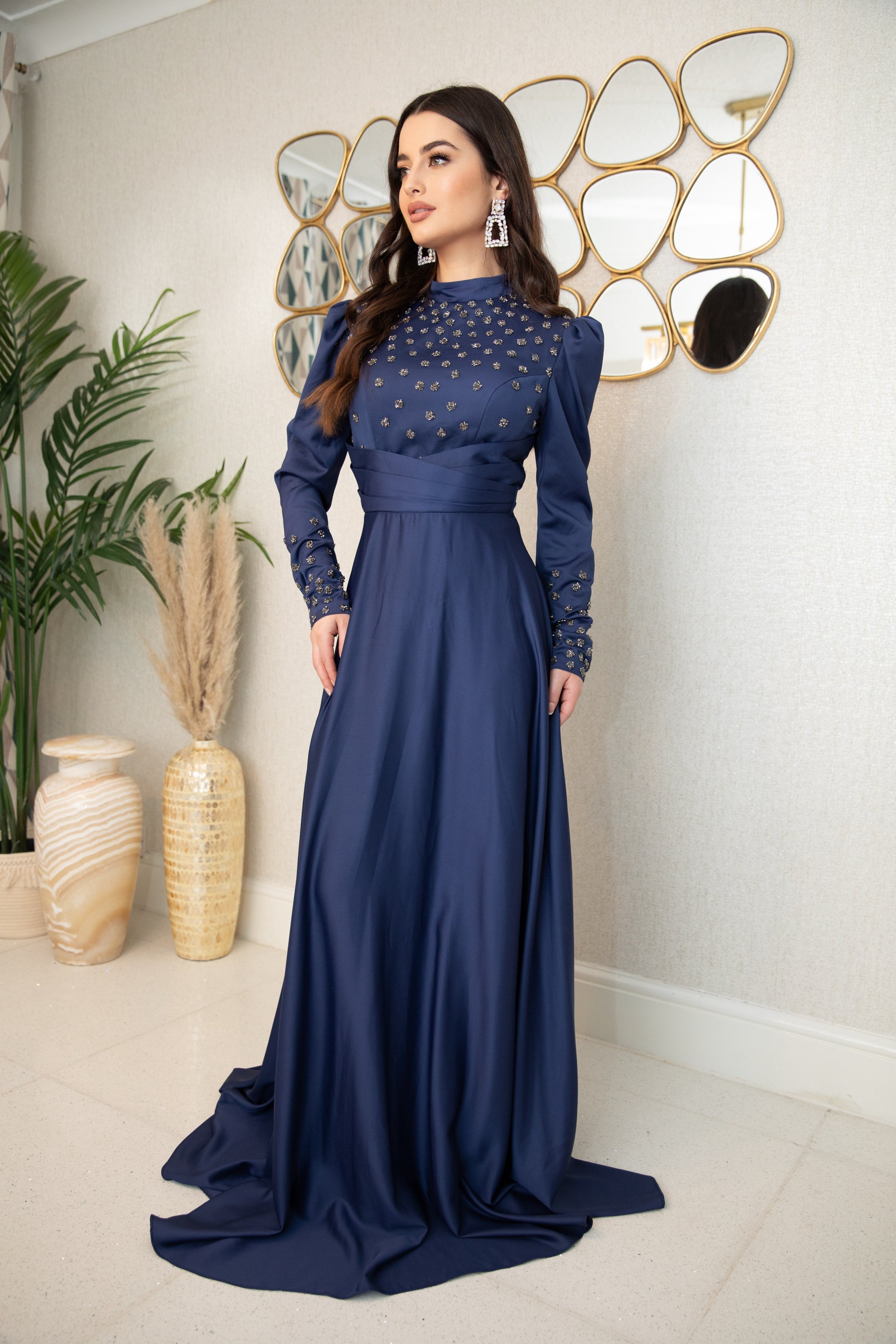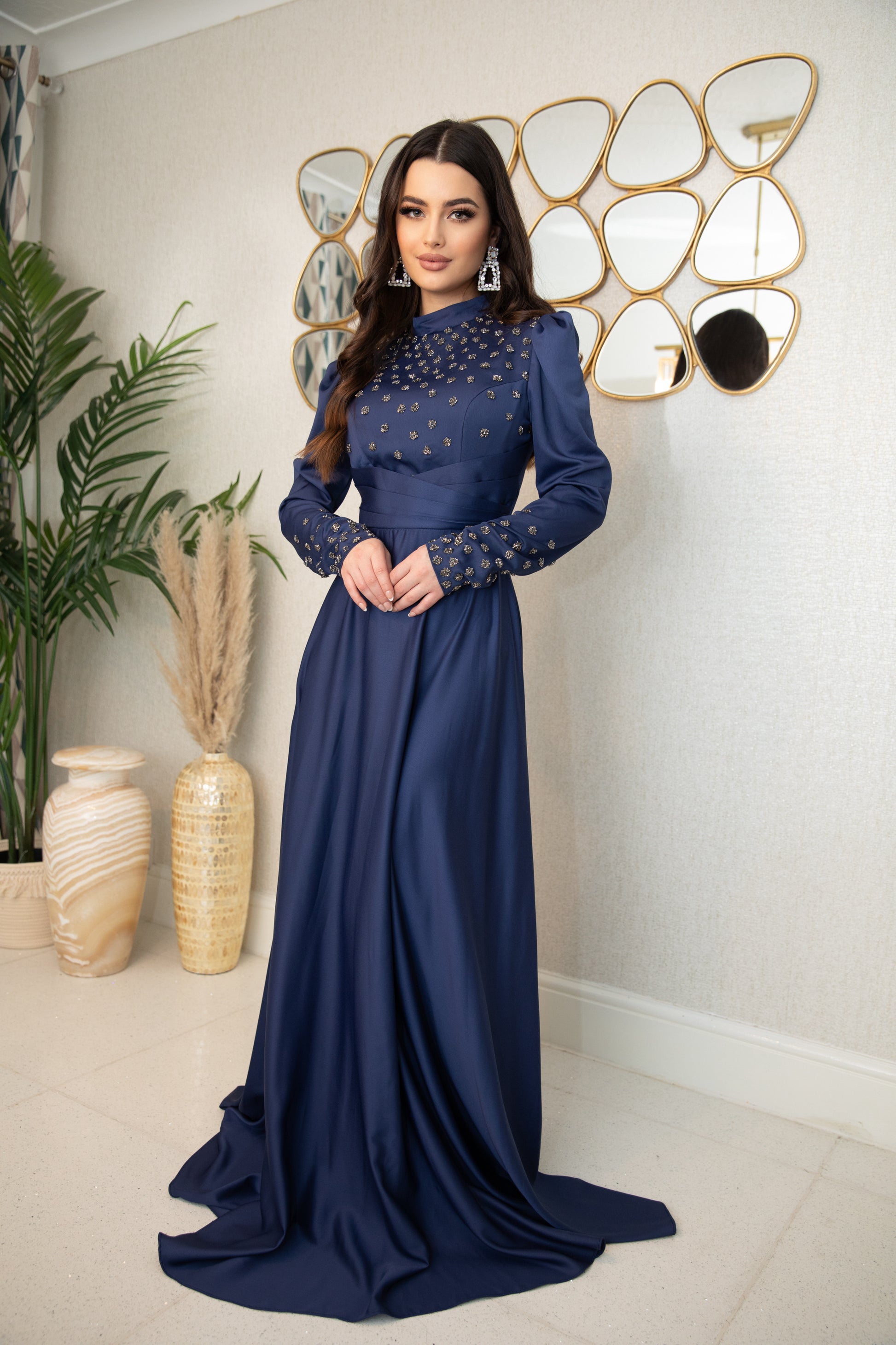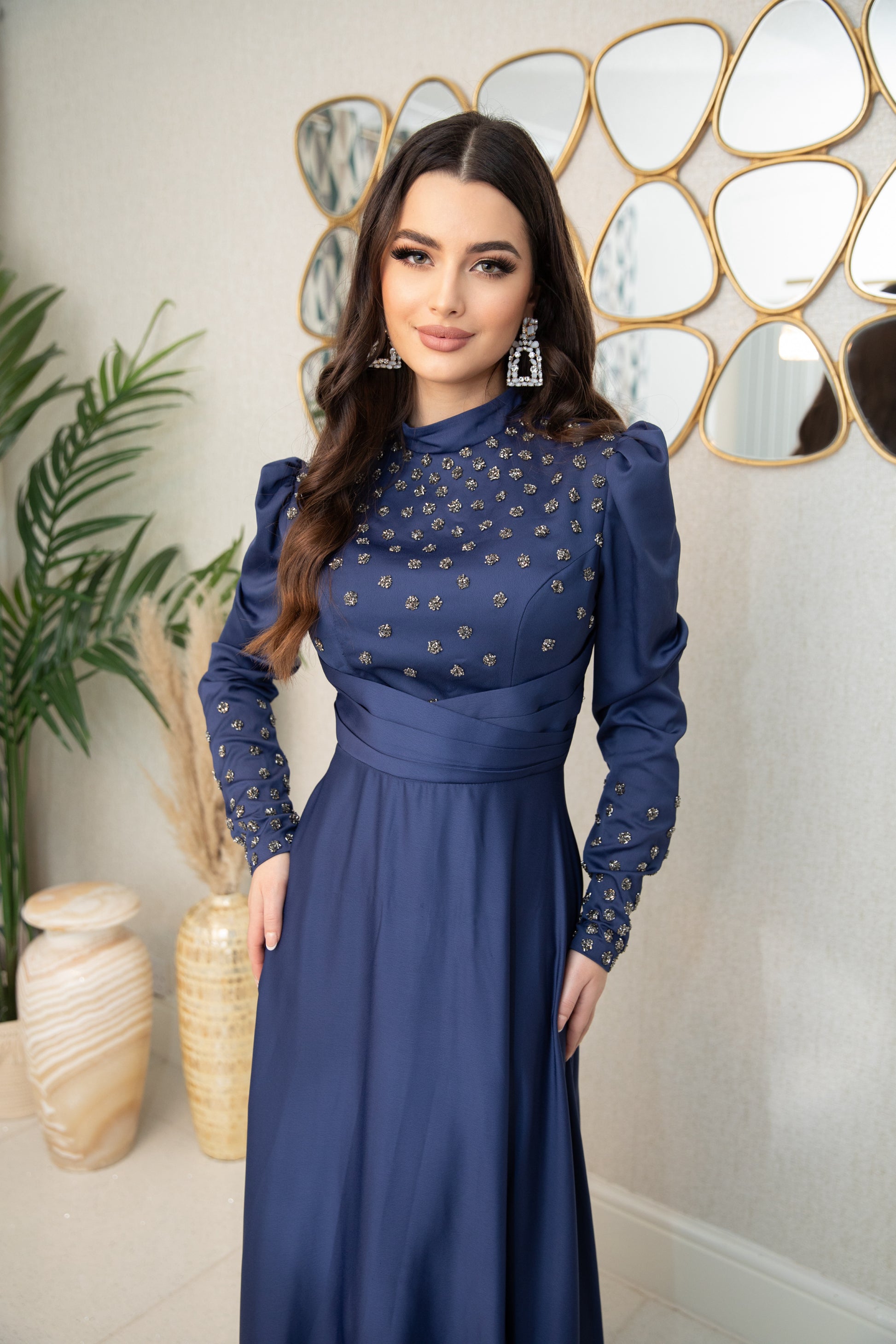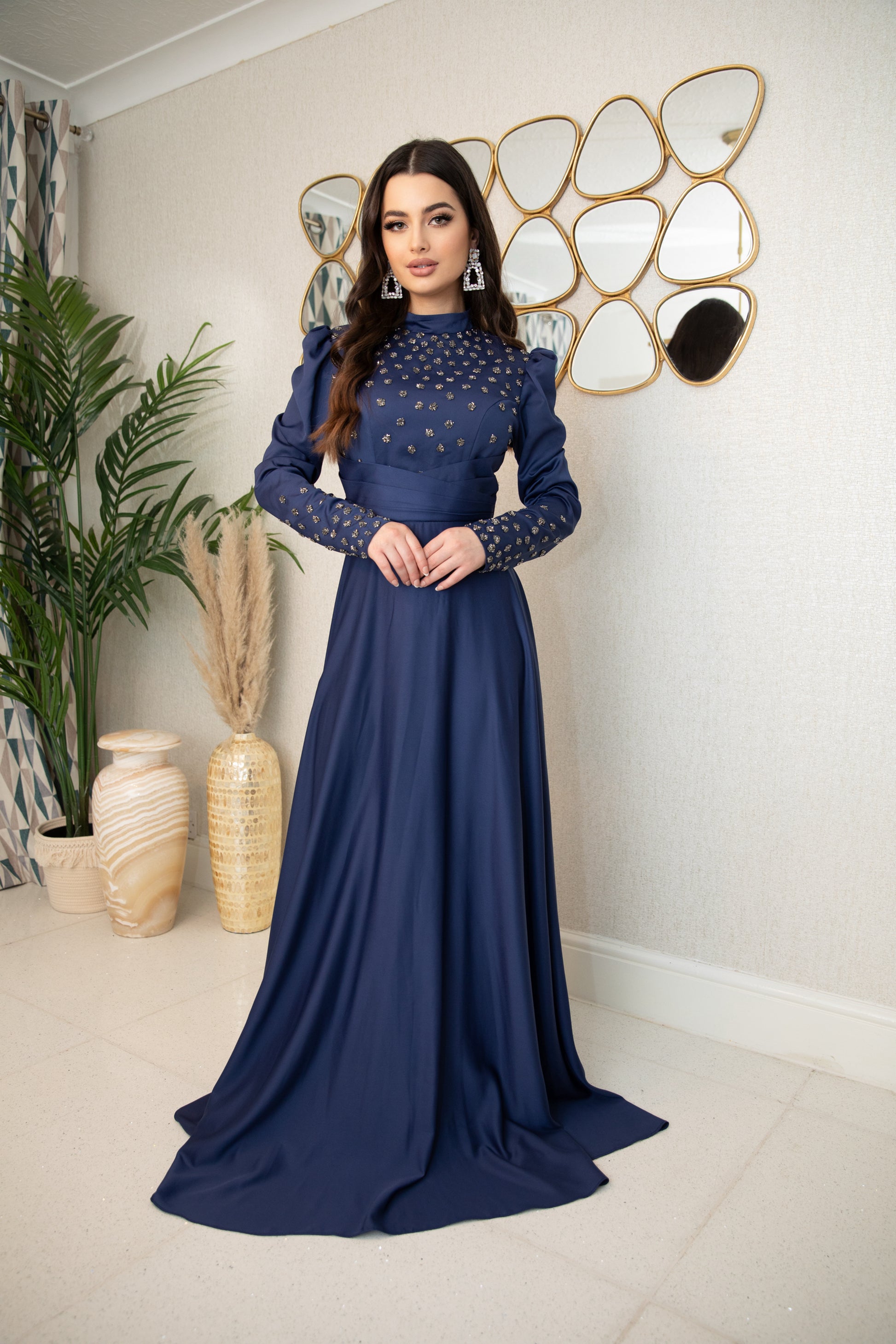 Indulge in the luxurious elegance of Raya. With its navy color and delicate detailing, this dress exudes richness and grace as it flows gracefully. Elevate your style and feel confident in this stunning piece.