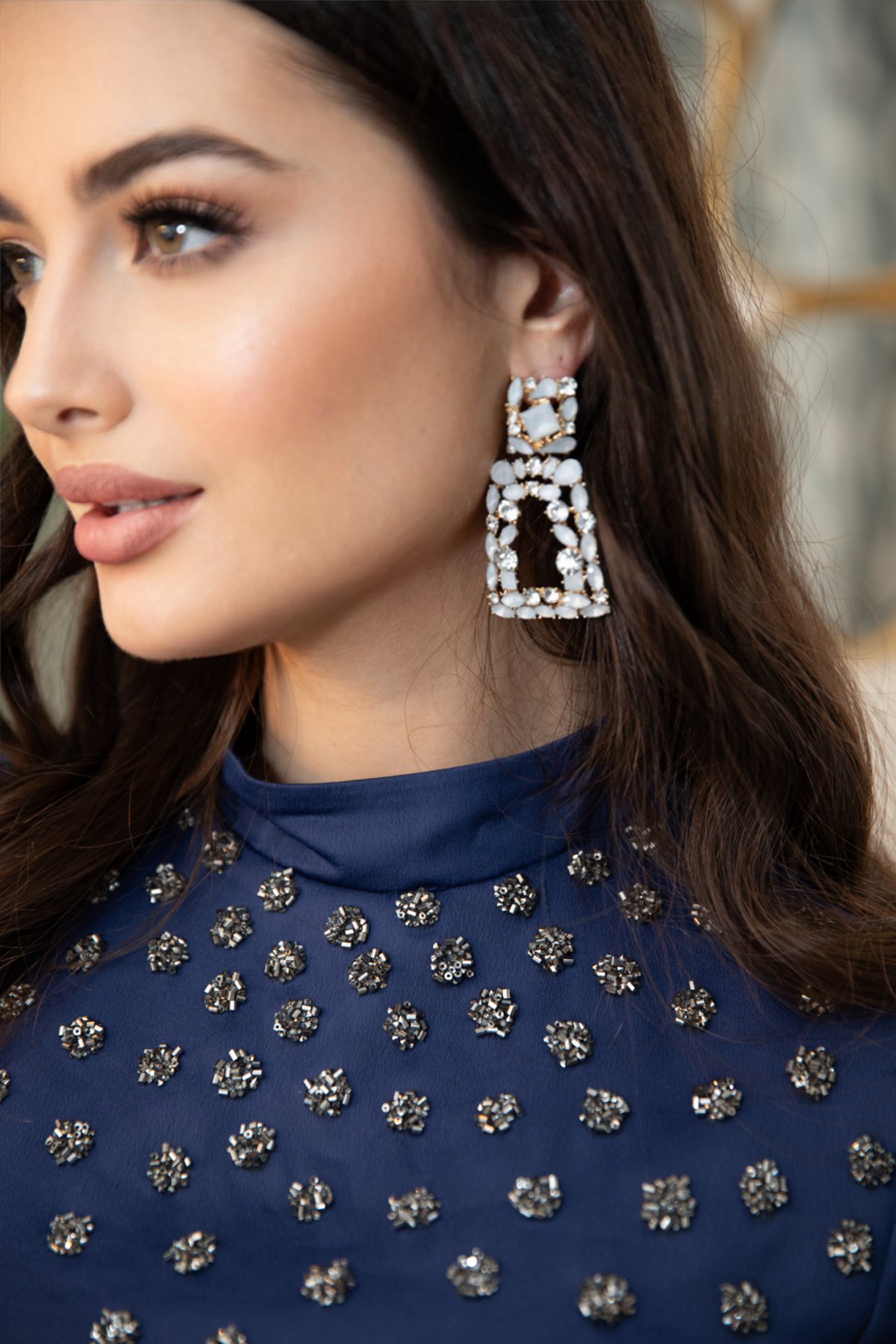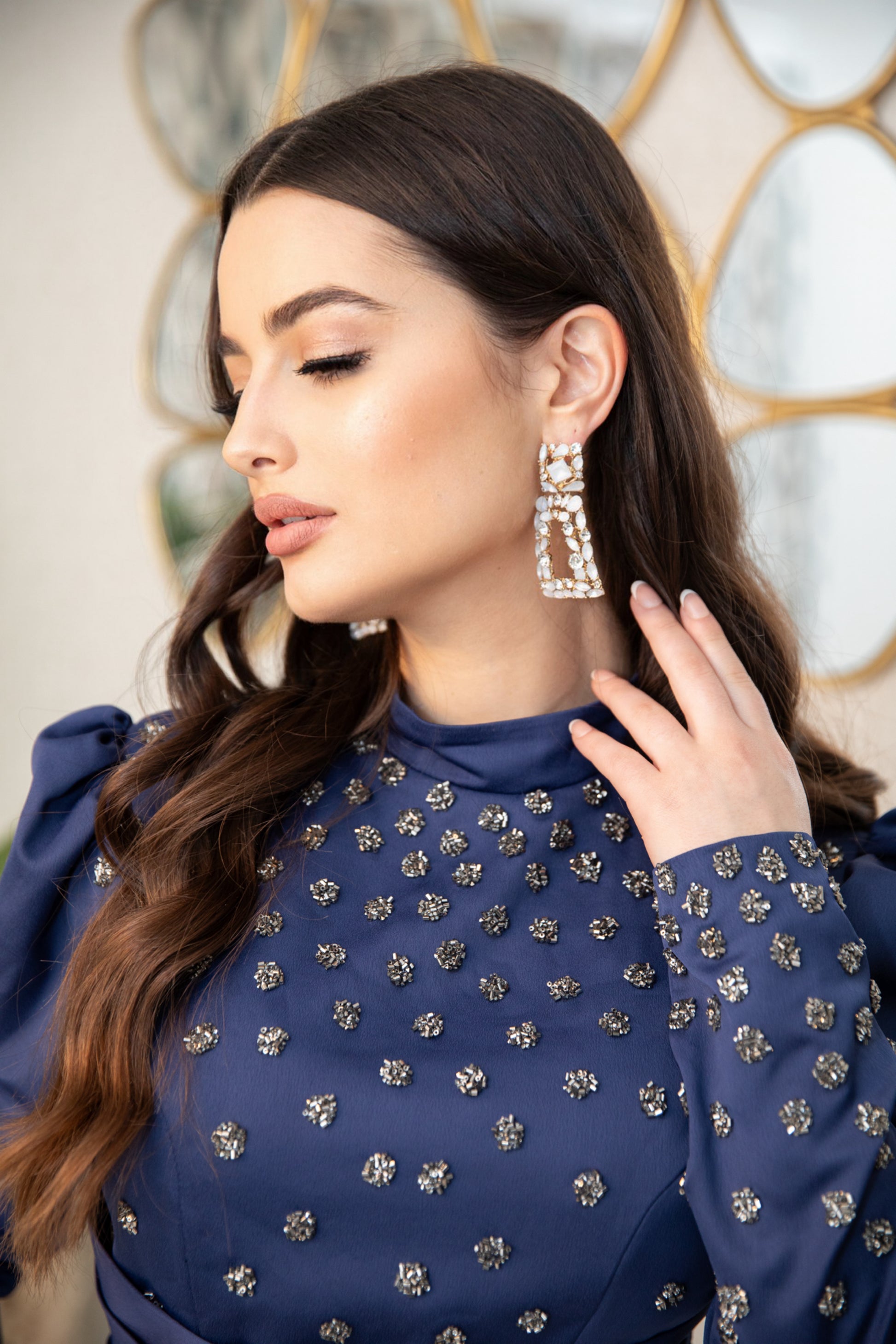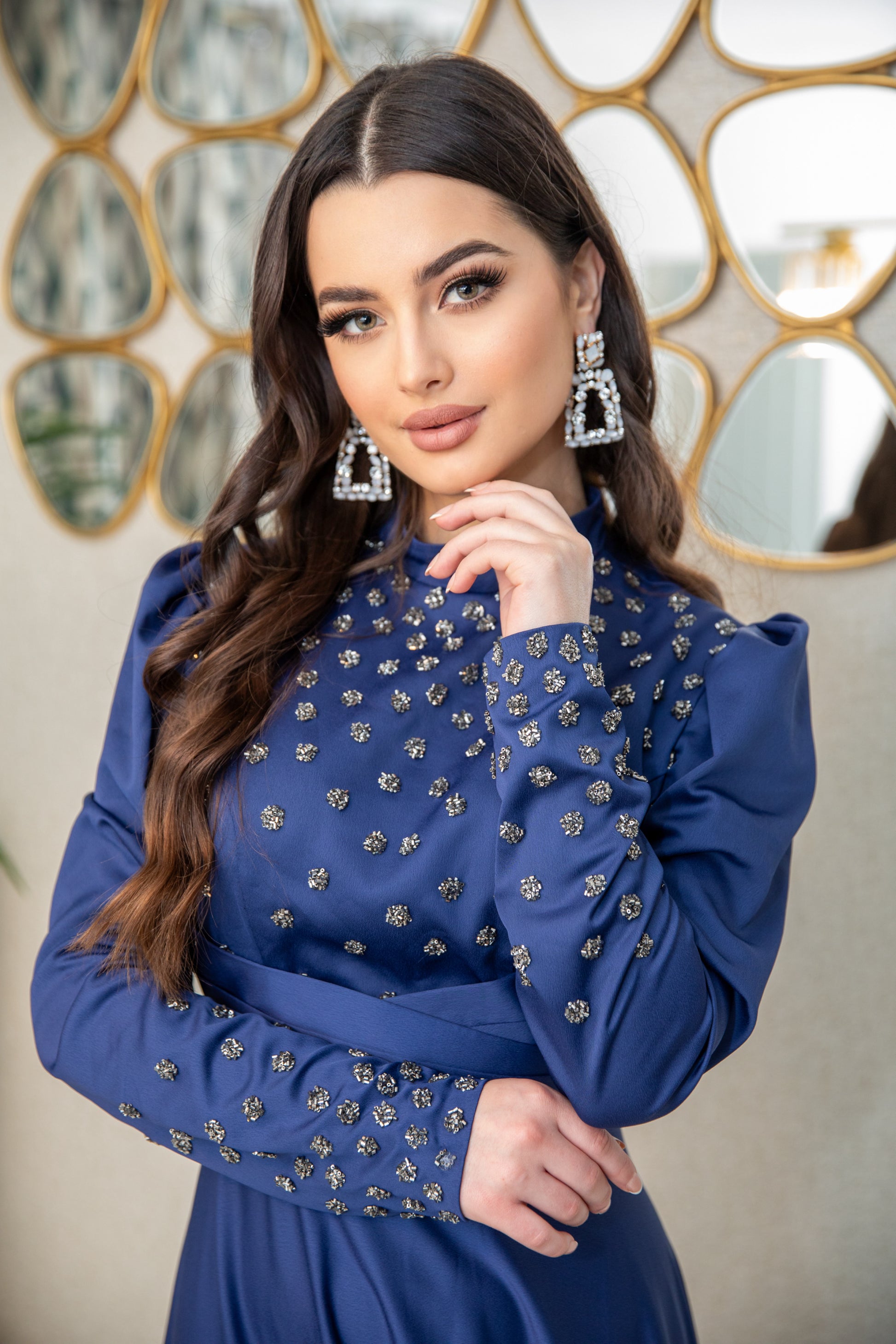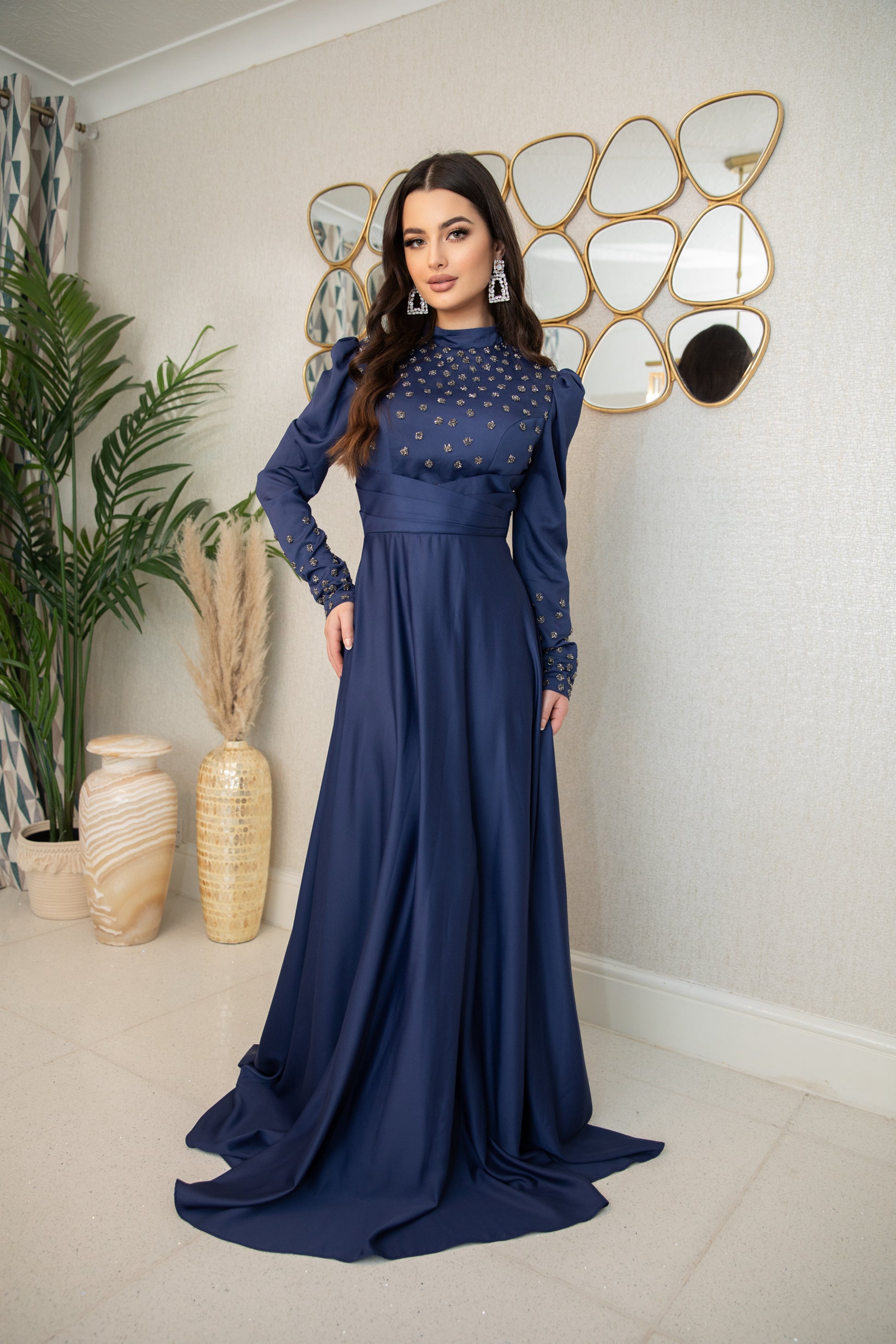 Indulge in the luxurious elegance of Raya. With its navy color and delicate detailing, this dress exudes richness and grace as it flows gracefully. Elevate your style and feel confident in this stunning piece.