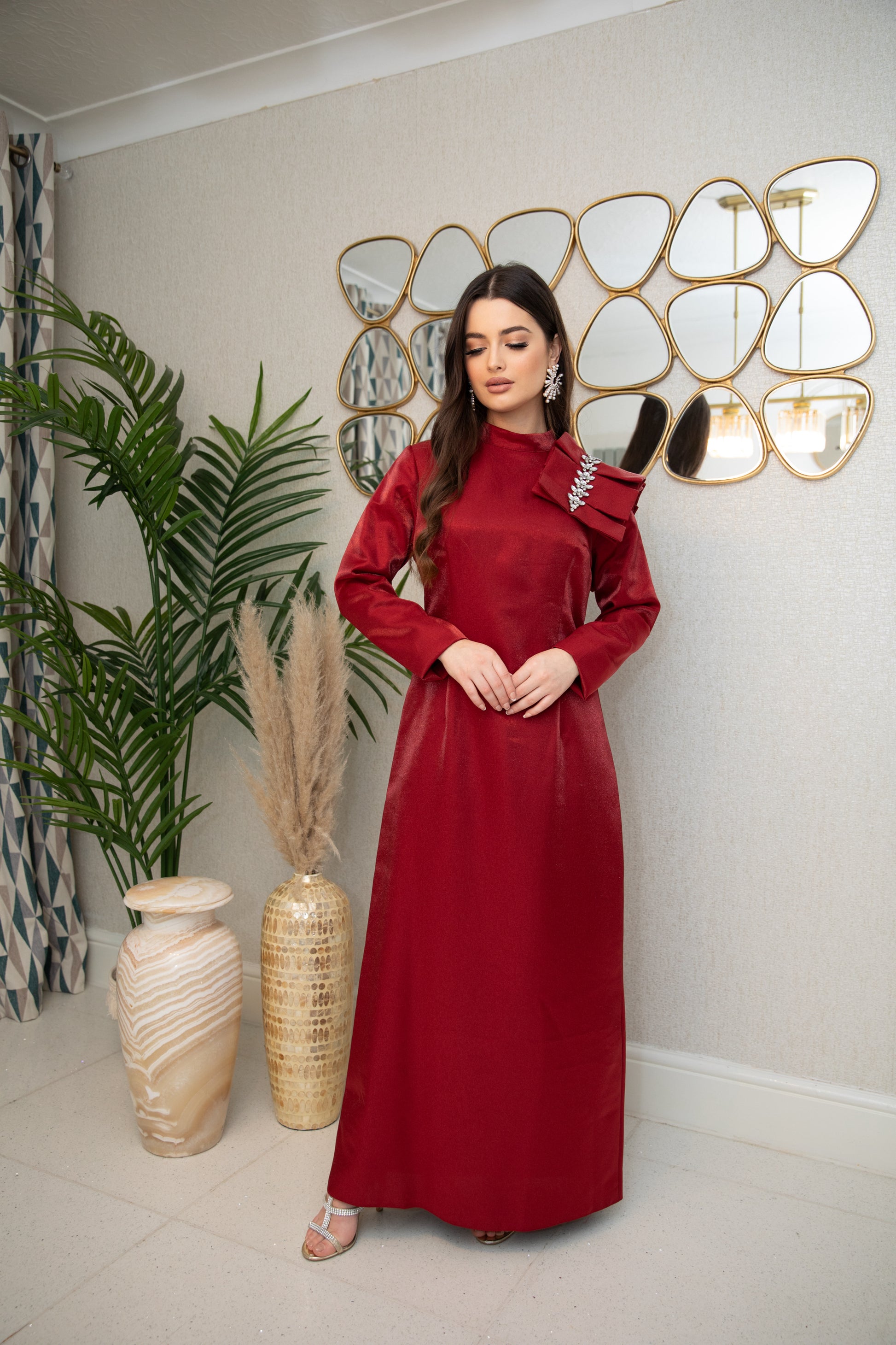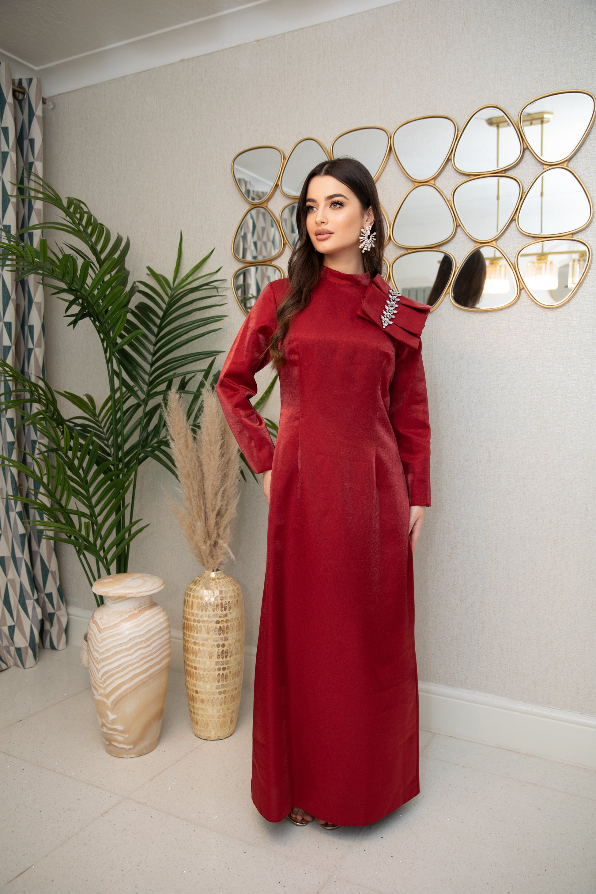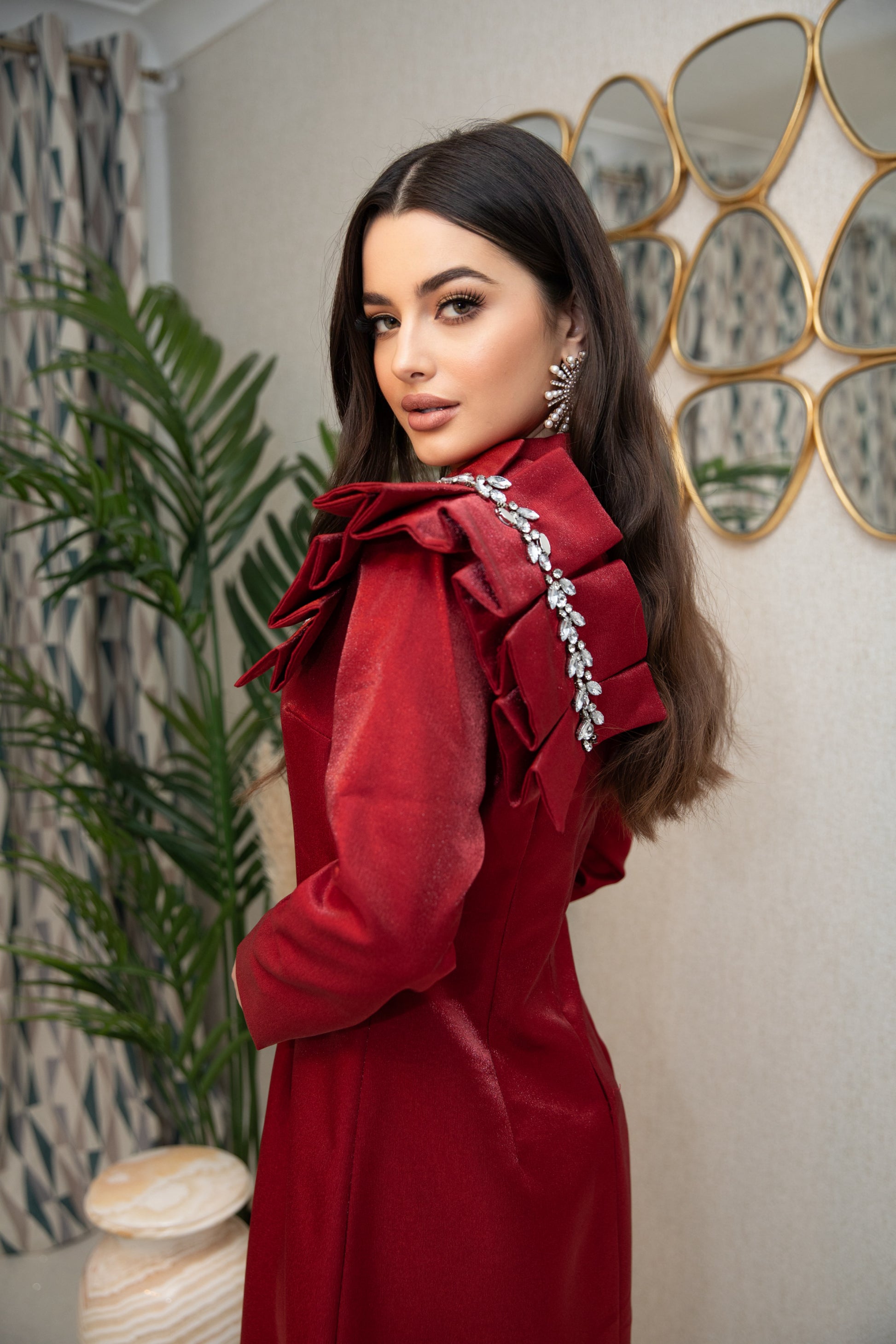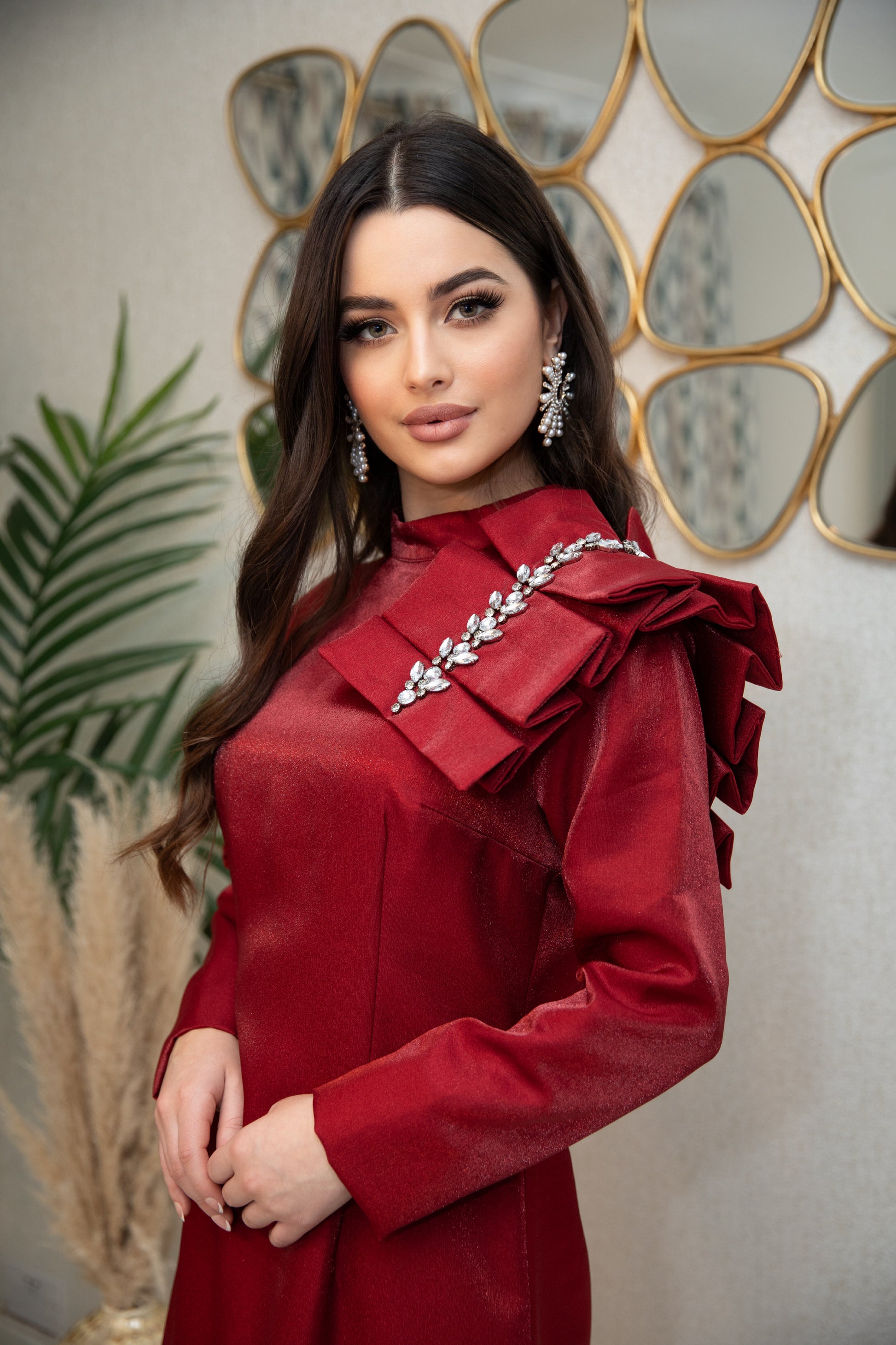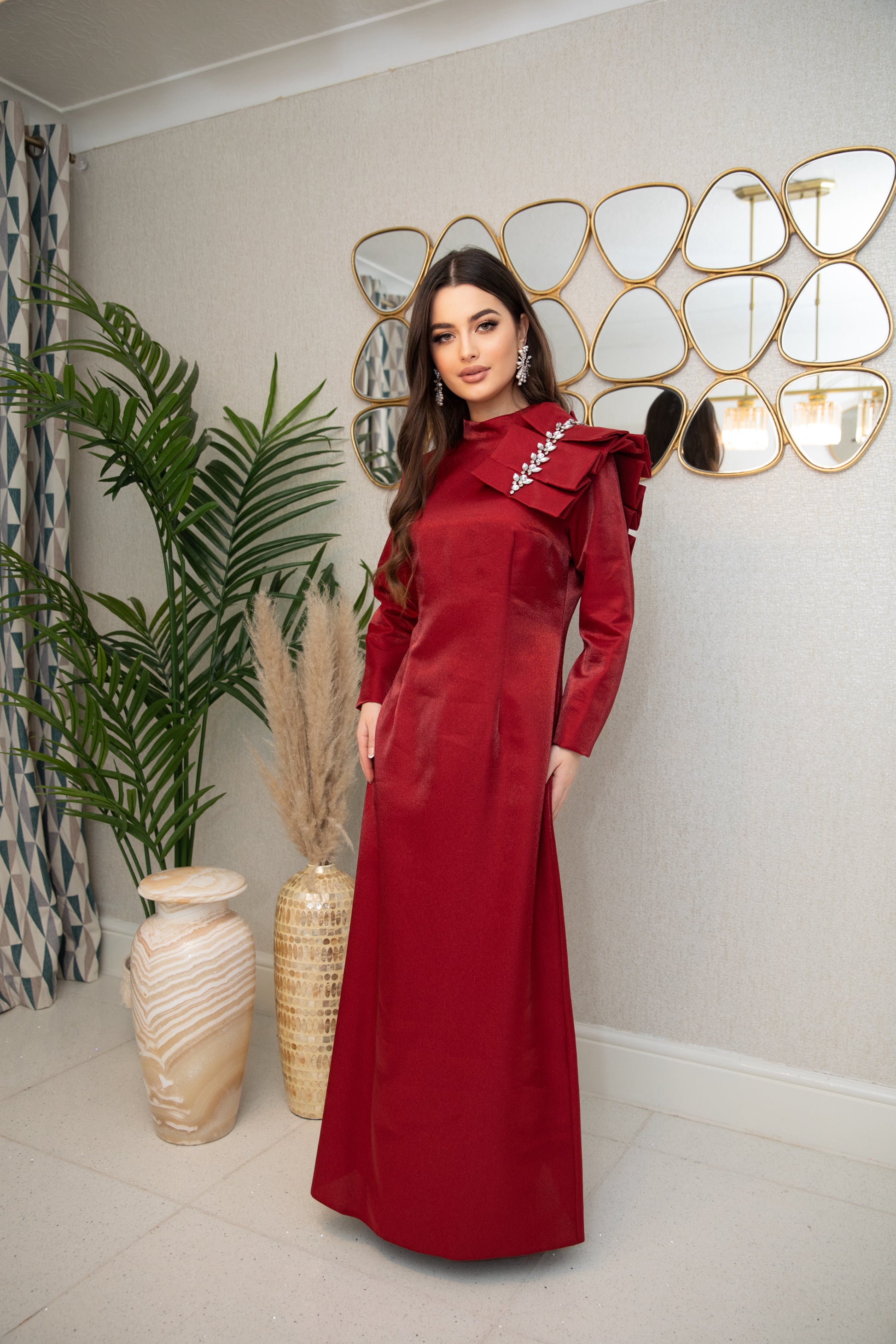 Introducing Rubina - a deep red dress that exudes elegance and simplicity. The unique shoulder design and delicate stone work make it a true work of art. Make a statement in this exclusive dress that is sure to turn heads. Elevate your style with Rubina.