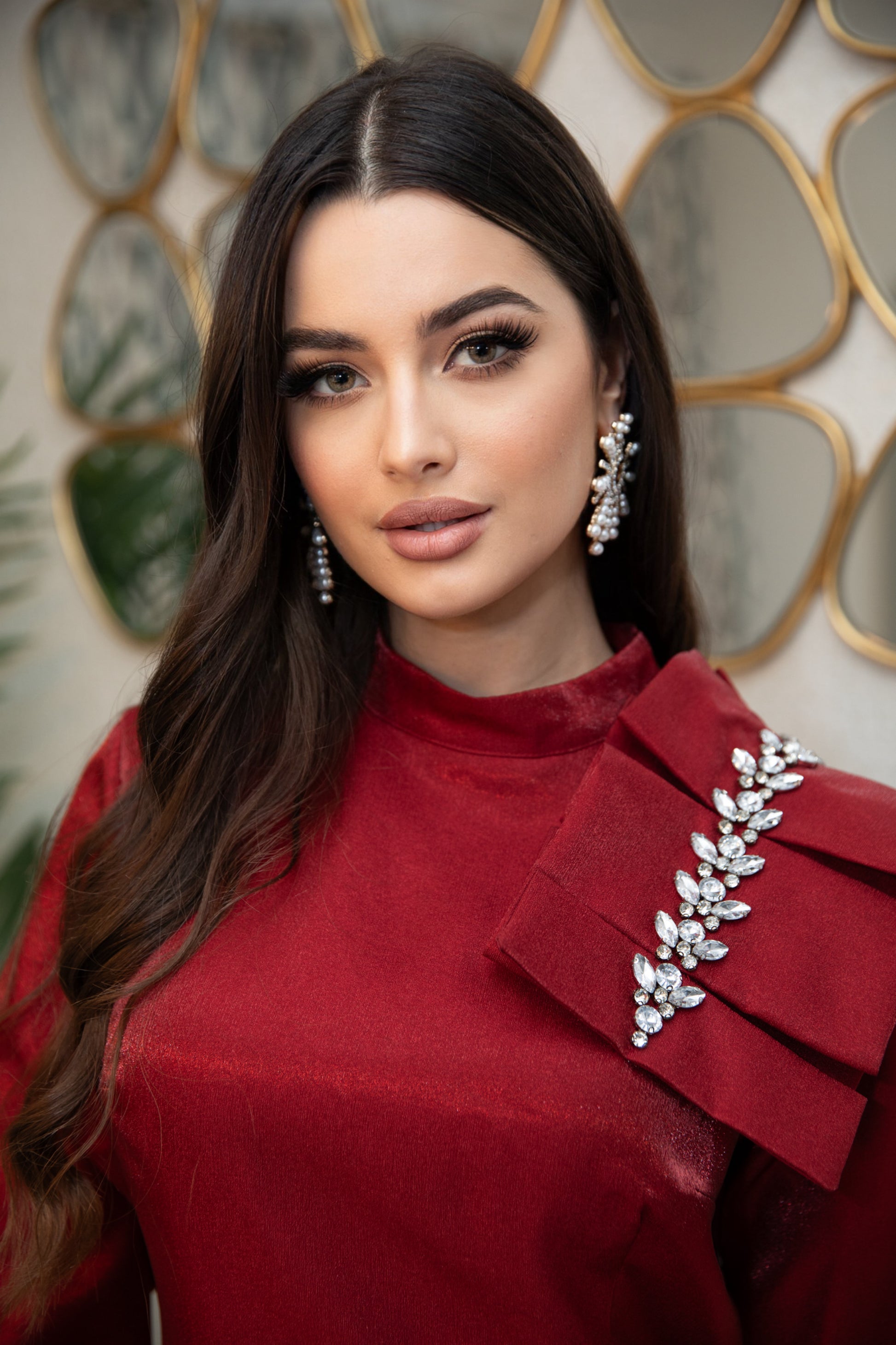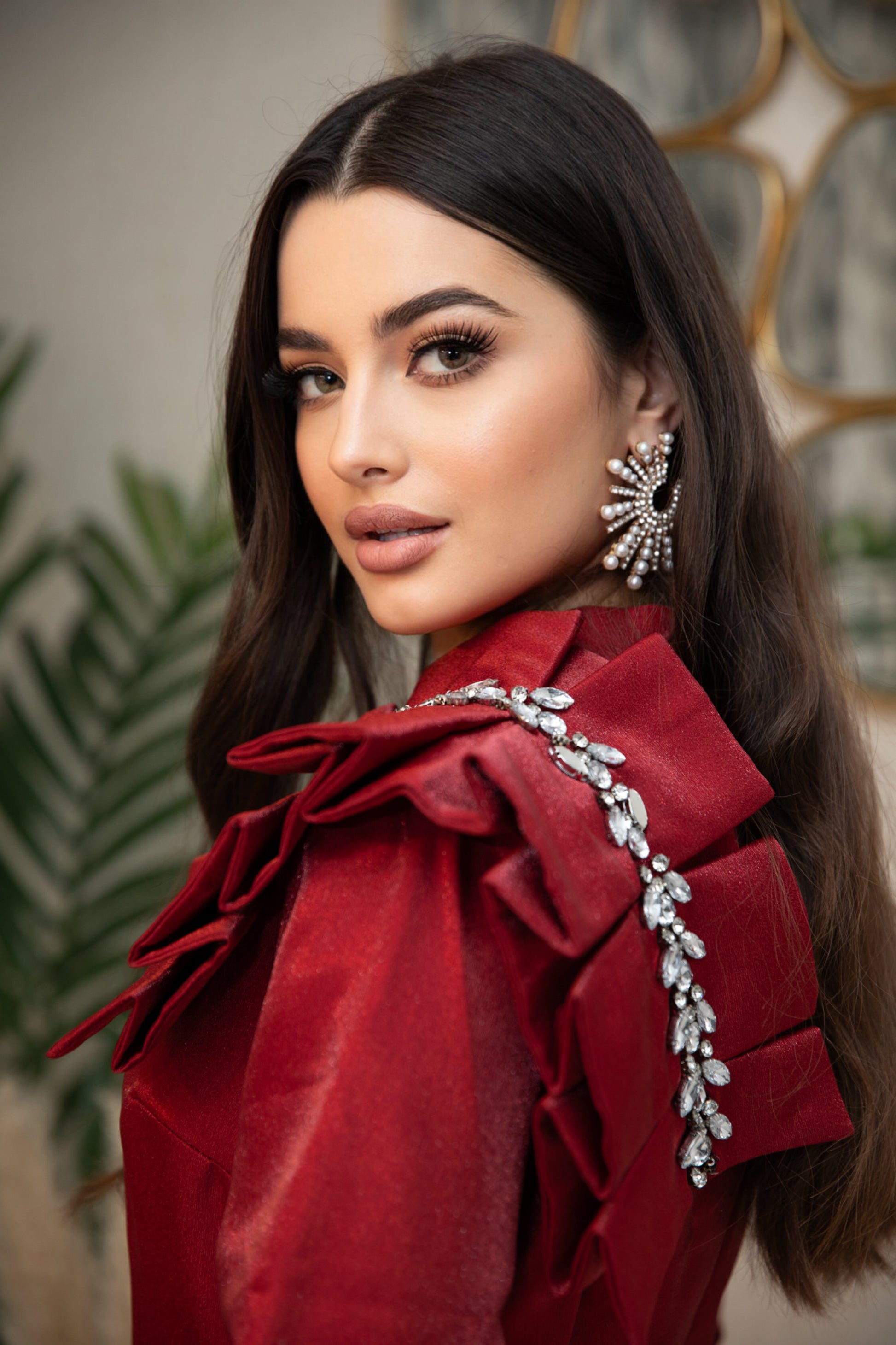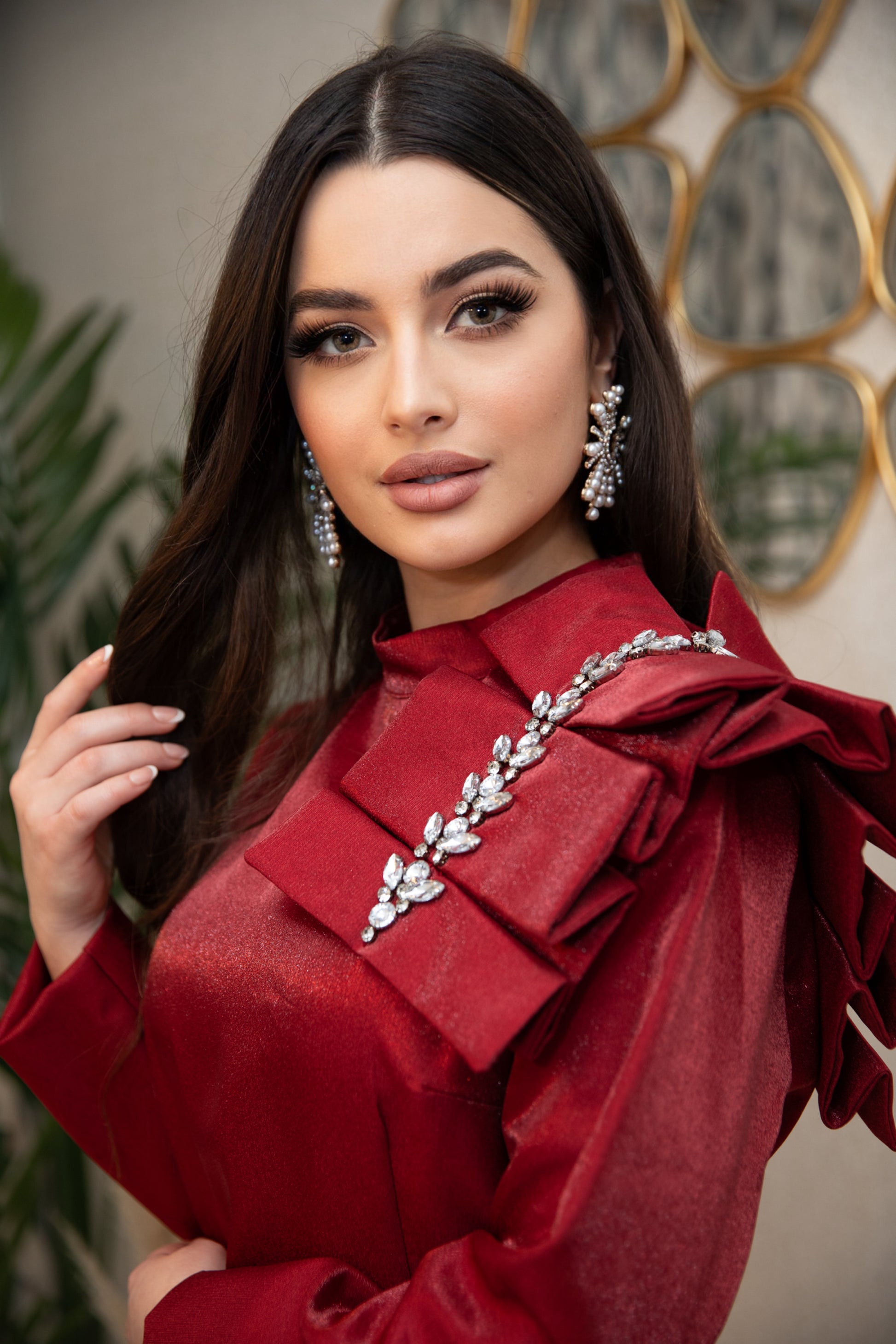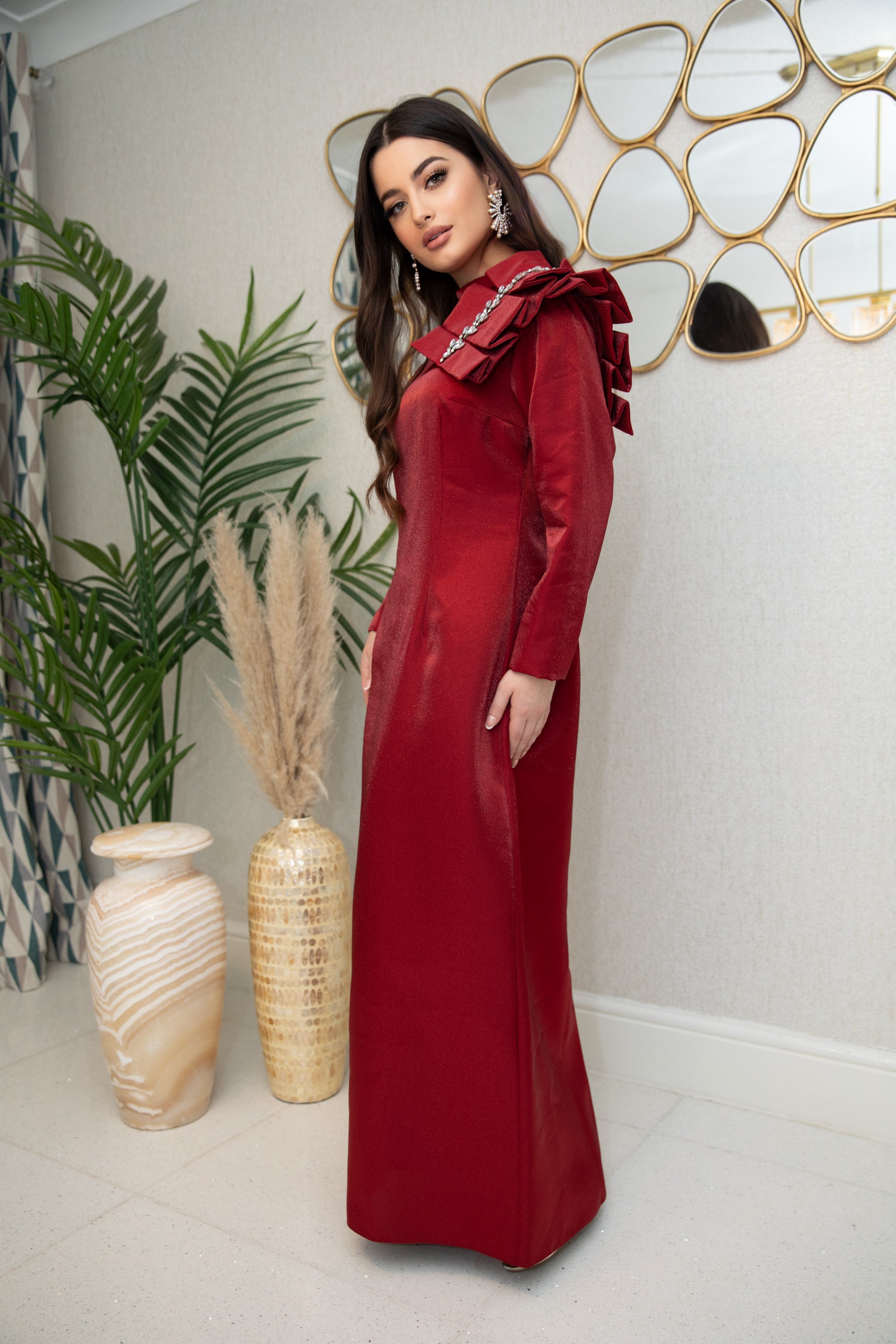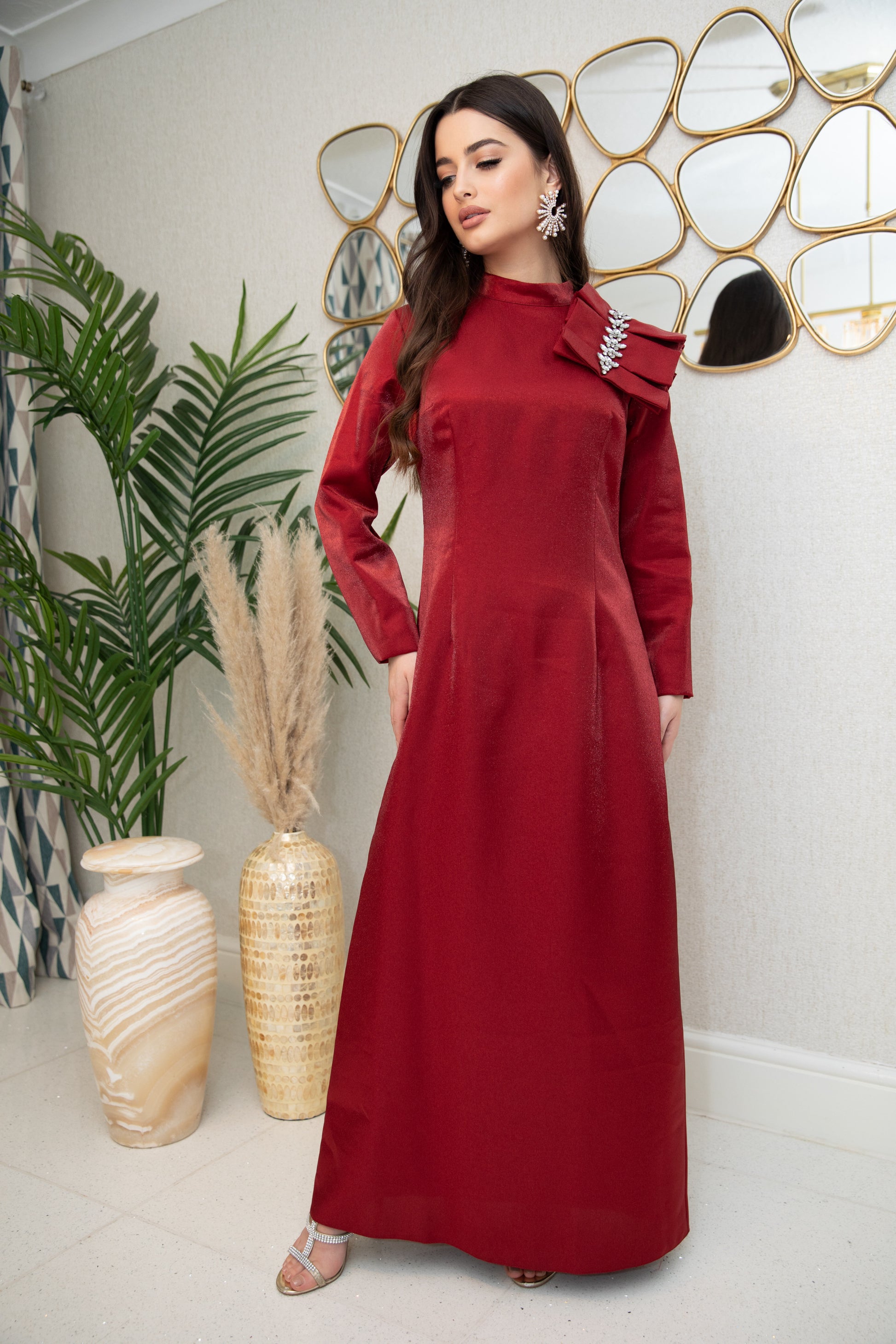 Introducing Rubina - a deep red dress that exudes elegance and simplicity. The unique shoulder design and delicate stone work make it a true work of art. Make a statement in this exclusive dress that is sure to turn heads. Elevate your style with Rubina.
