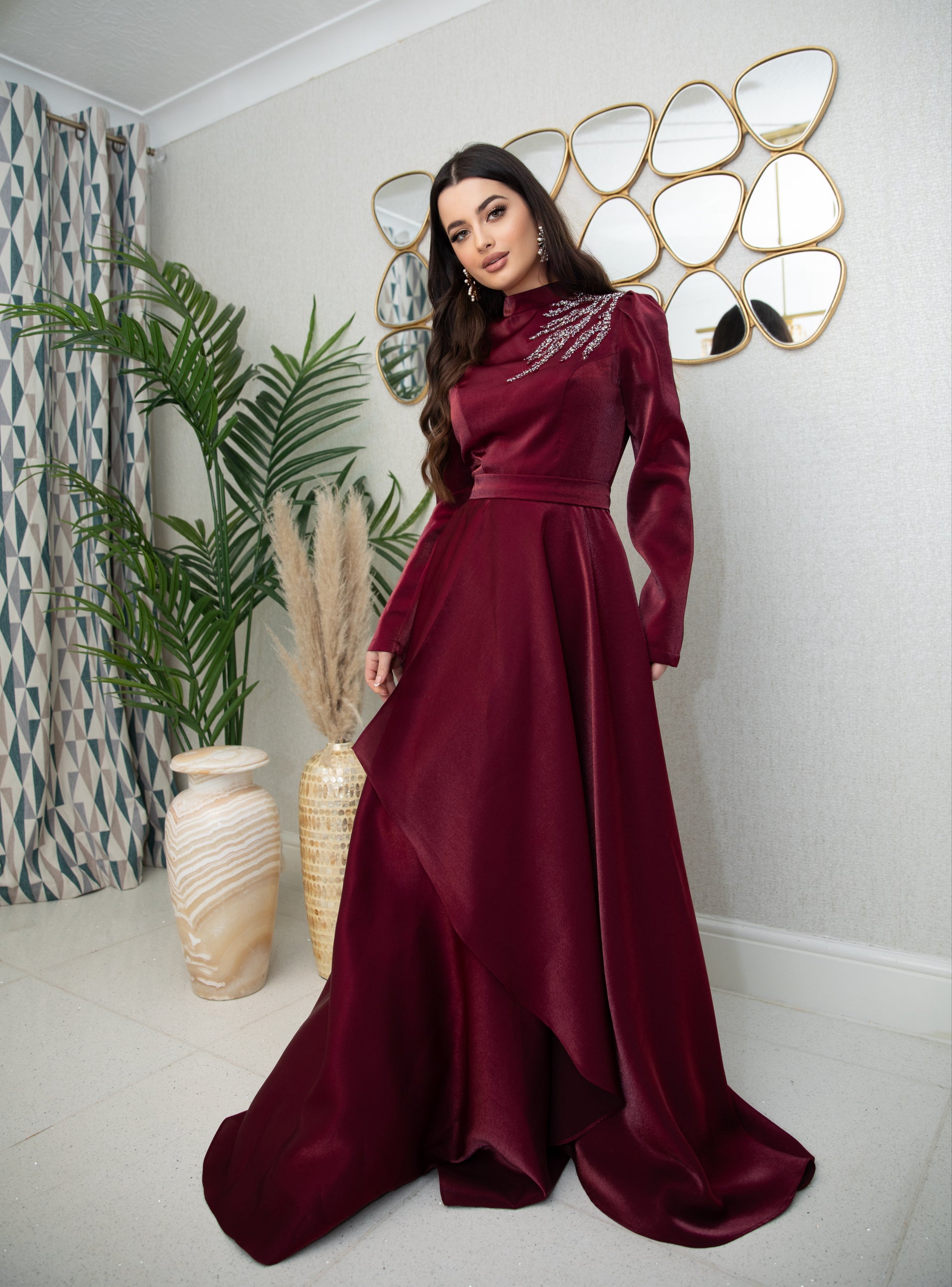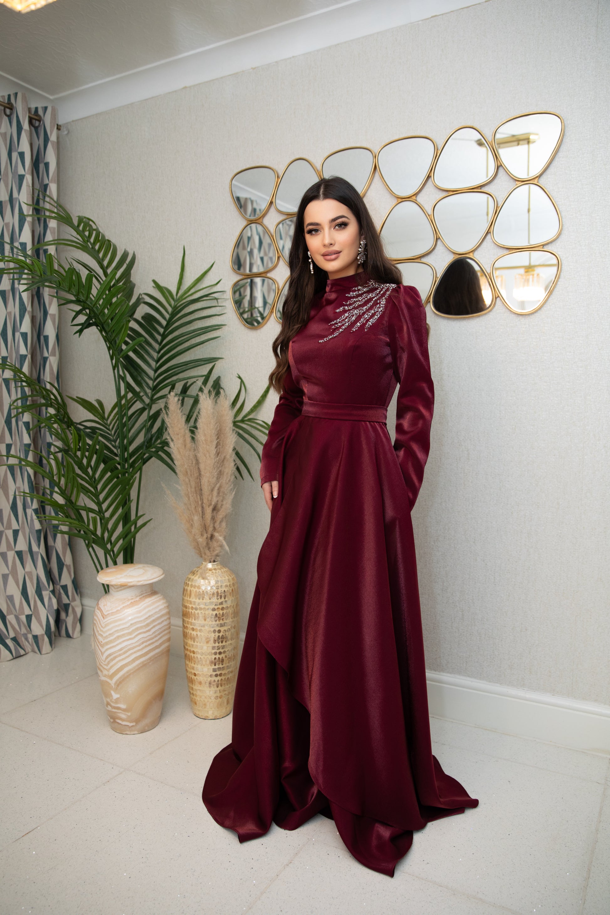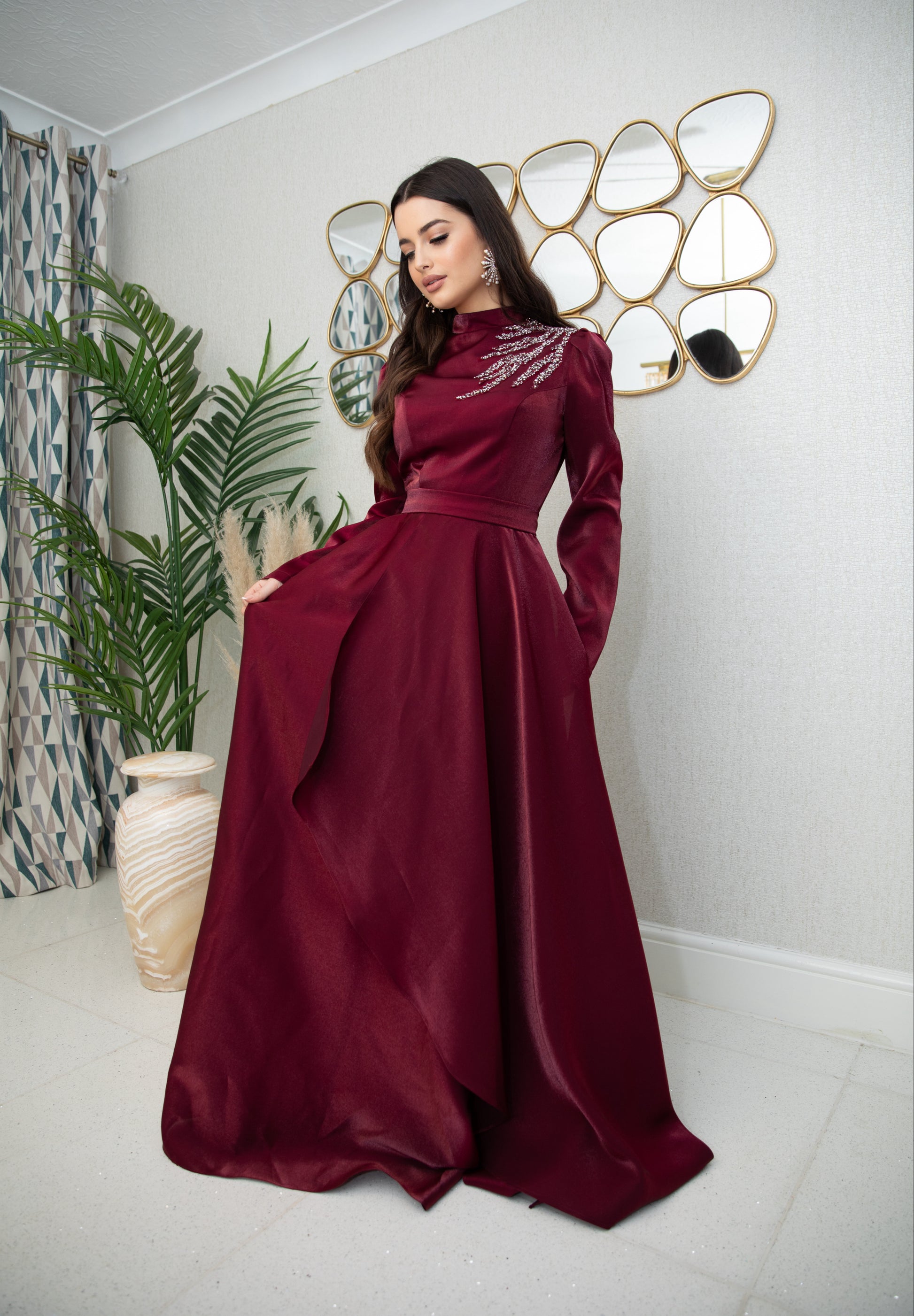 Yalda offers high-quality, layered and modest clothing with full sleeves and a floor-length design. Made with a luxurious maroon fabric, this garment exudes elegance and sophistication. Perfect for formal occasions or everyday wear, it provides comfort and style.