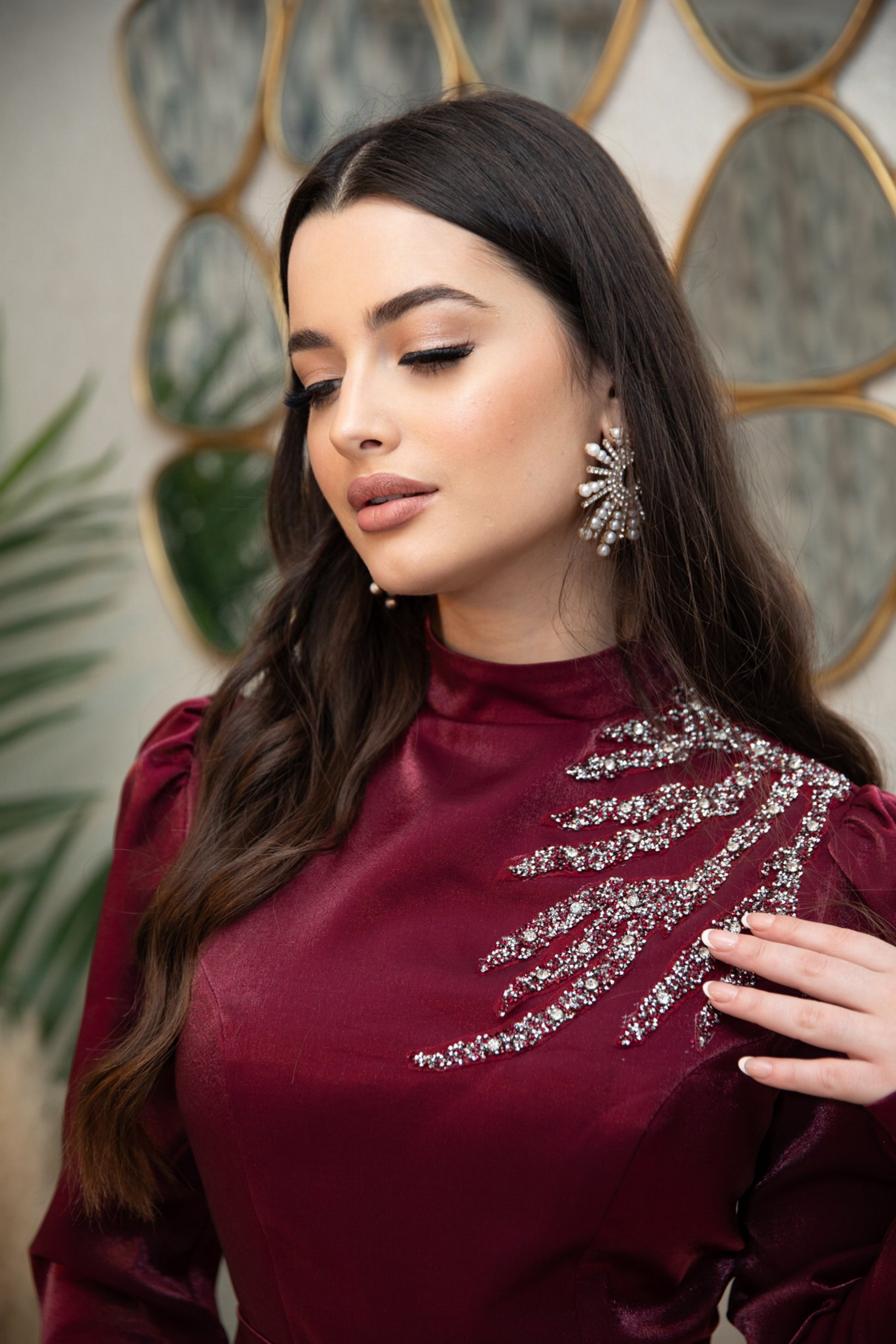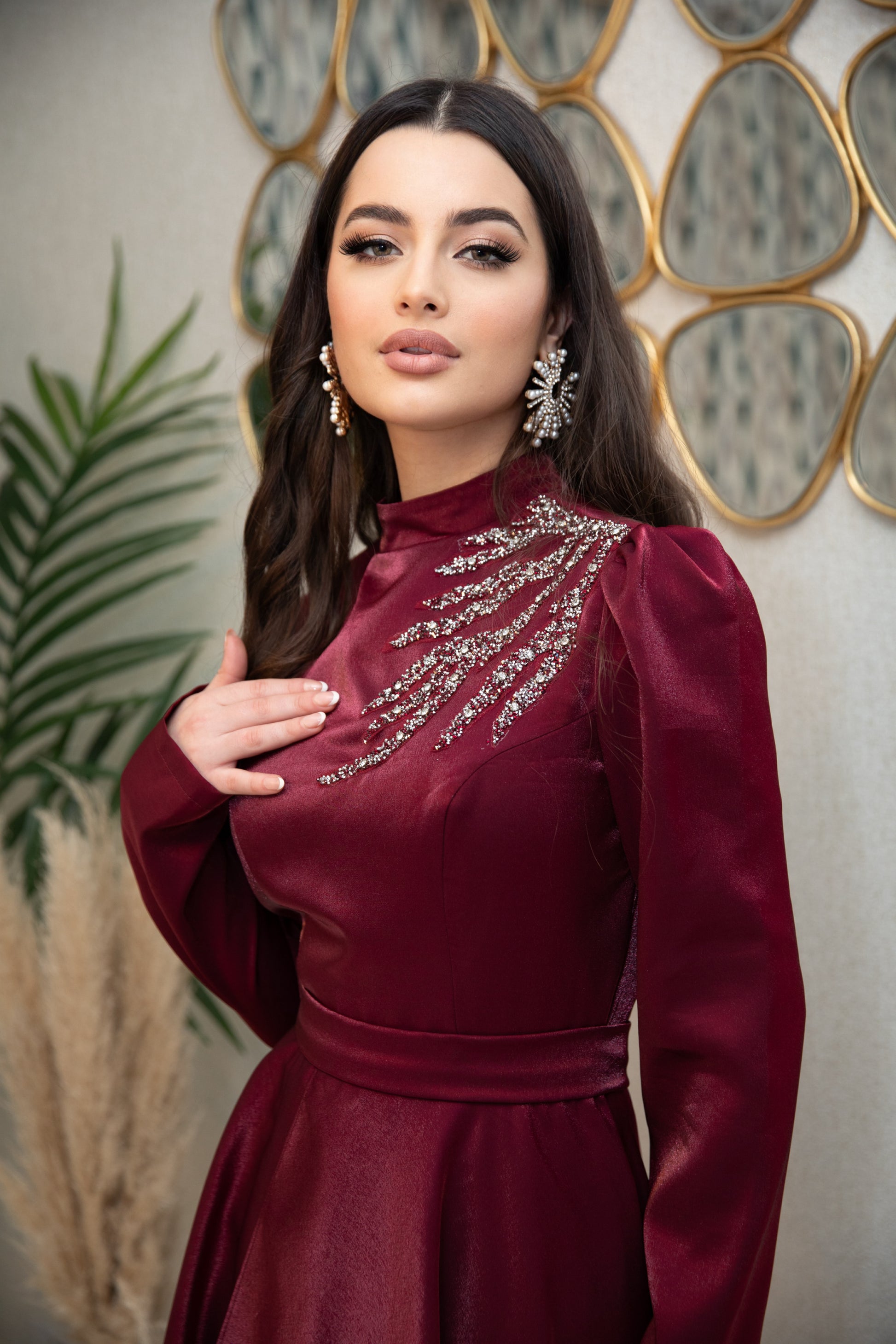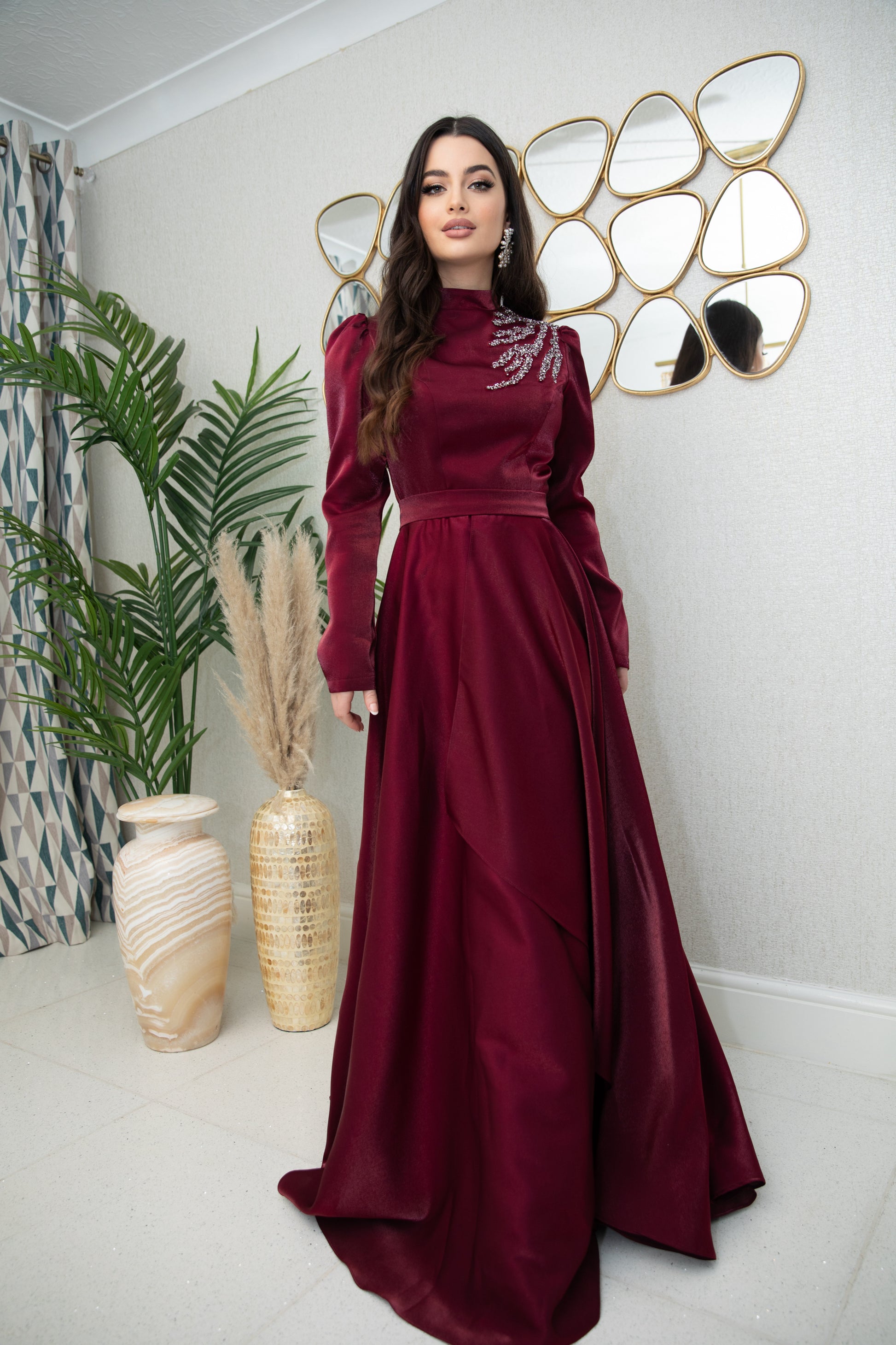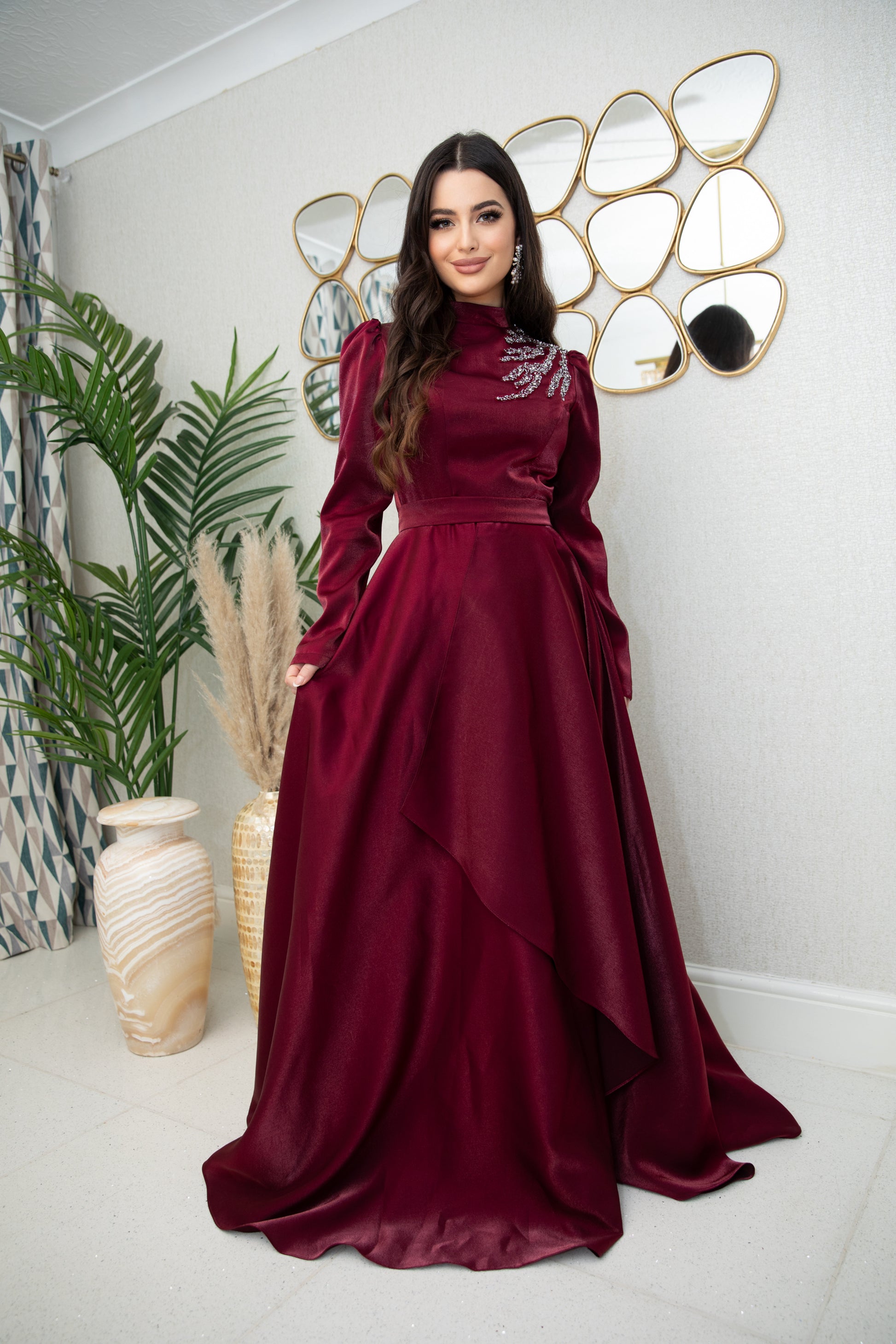 Yalda offers high-quality, layered and modest clothing with full sleeves and a floor-length design. Made with a luxurious maroon fabric, this garment exudes elegance and sophistication. Perfect for formal occasions or everyday wear, it provides comfort and style.