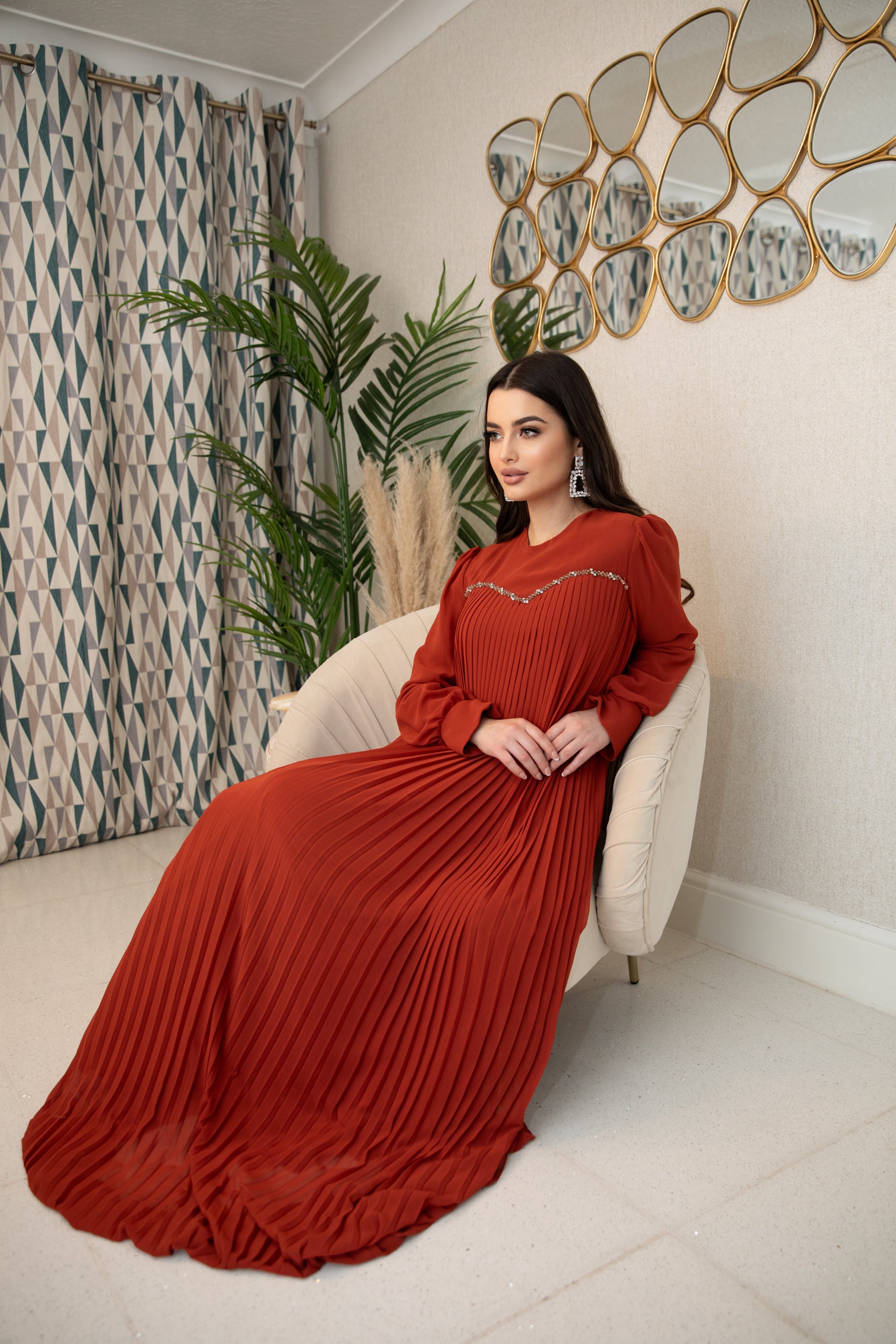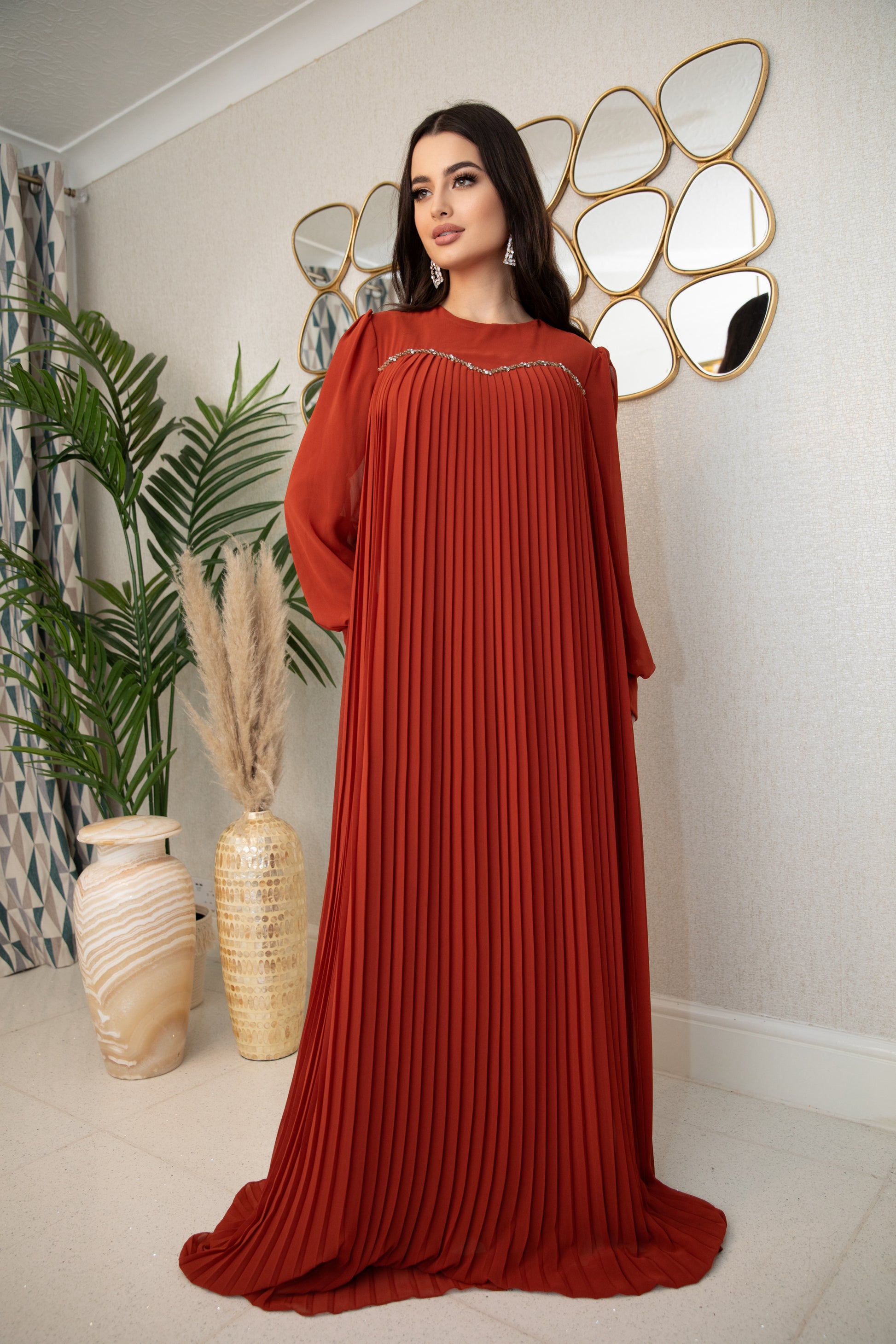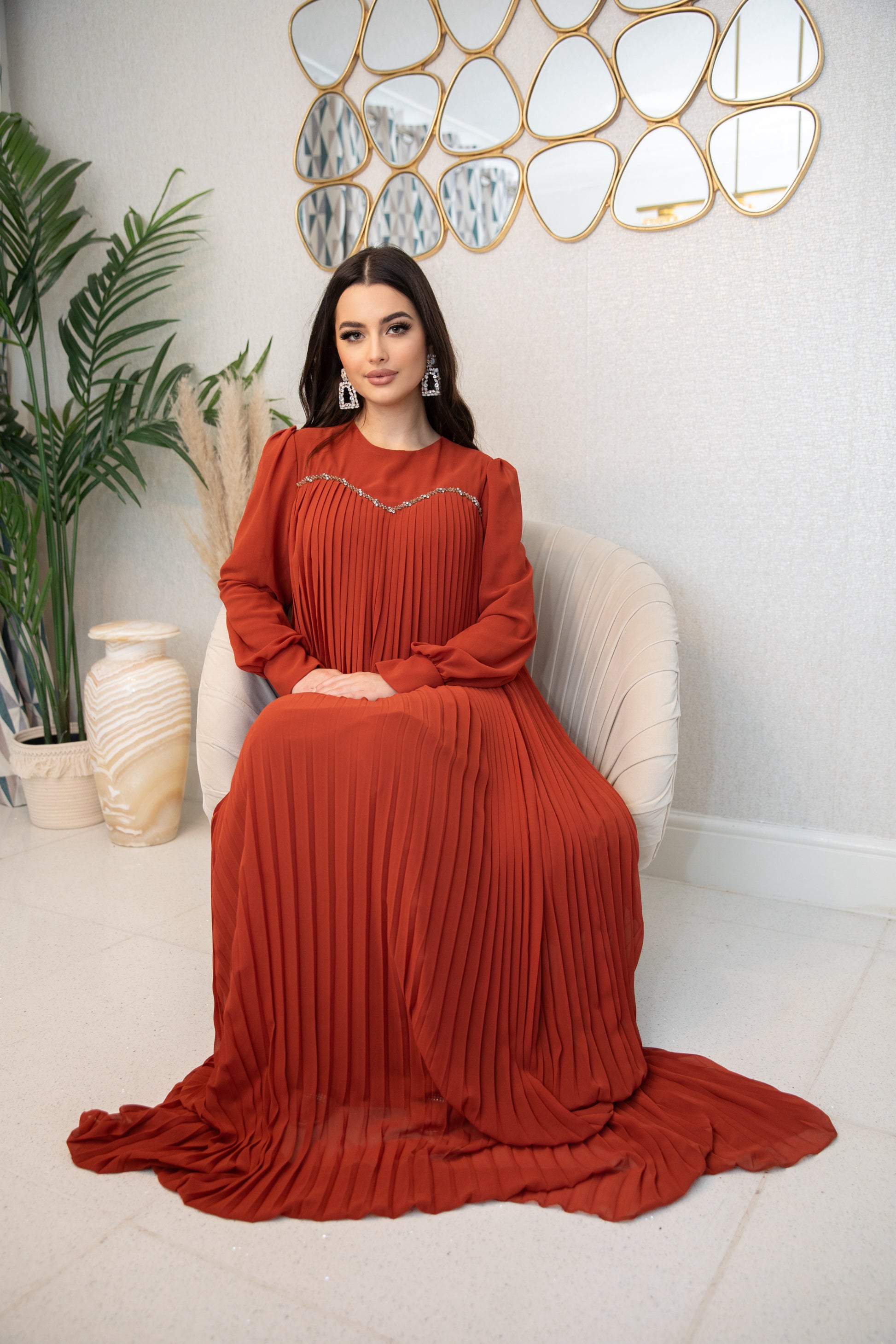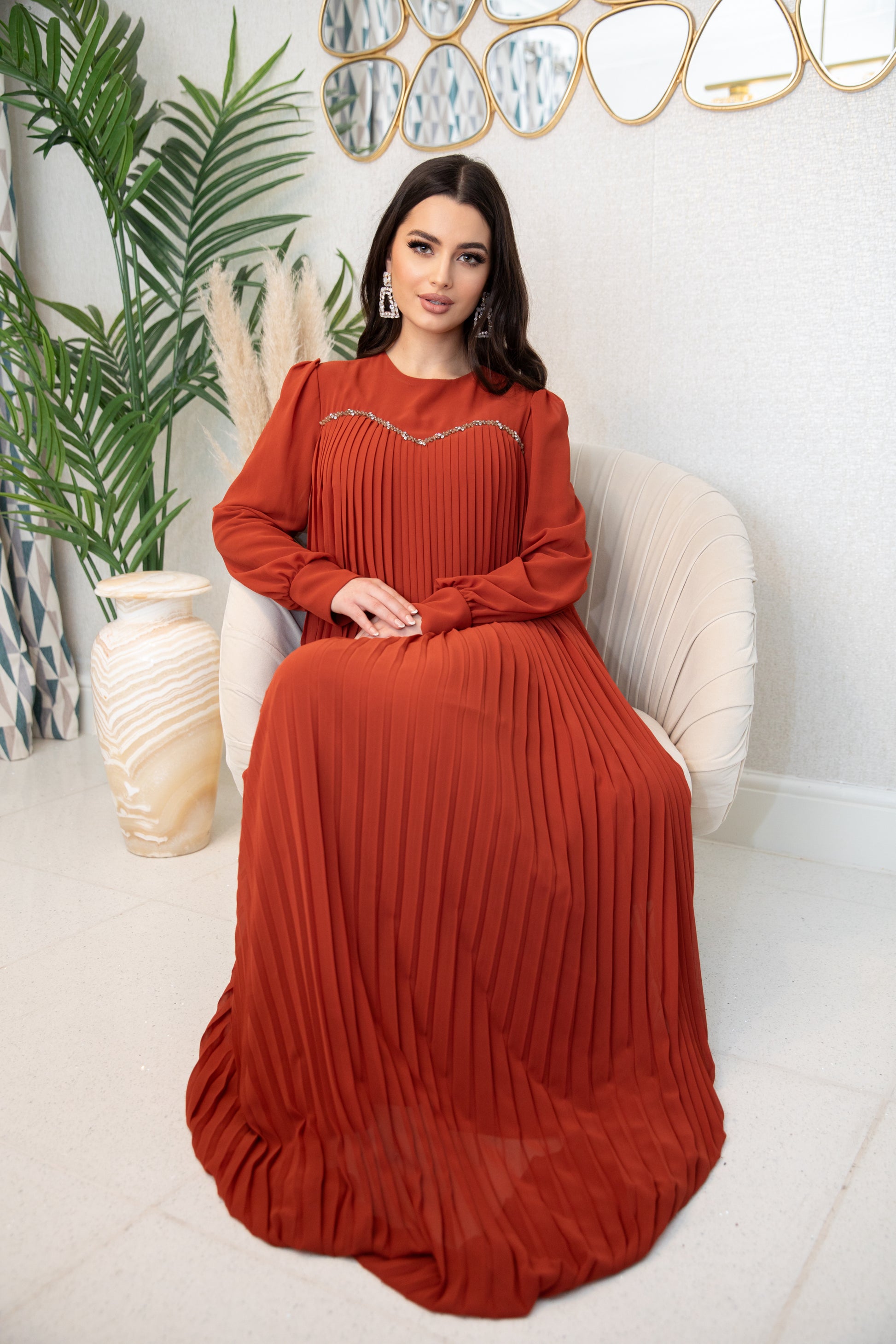 Indulge in the luxurious comfort of Zenar. A perfect combination of burnt orange color and intricate bead work, this modest yet stylish piece is designed to elevate your wardrobe. Experience sophistication and elegance with every wear.